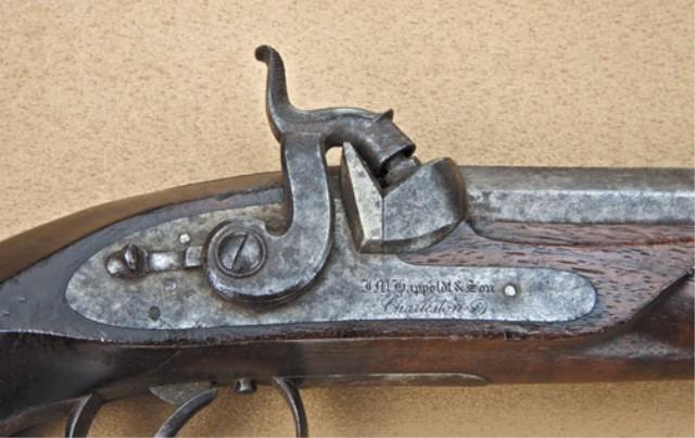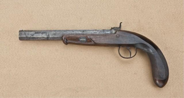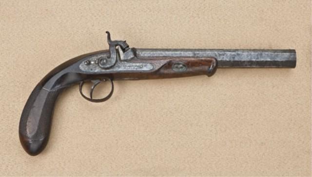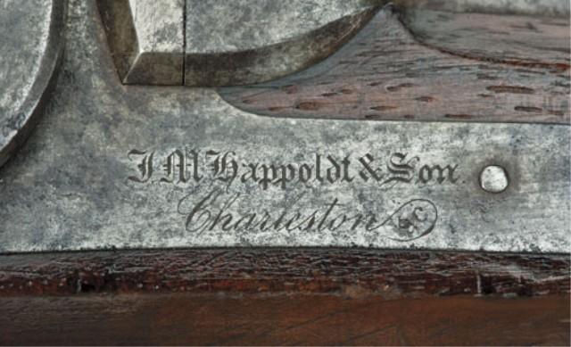 Single shot percussion dueling/target pistol signed J. M. Happoldt and son, Charleston SC in fancy script engraved letters on lock. 8-1/4” heavy octagon barrel measuring nearly 7/8” across the flat of the muzzle. Approx. .41 caliber smooth bore, half-stocked in good quality walnut showing flattened sides in typical checkering with distinctive border. The pistol shows a grey to brown patina finish with strong traces of case hardening on the light. Some light to moderate erosion on the lock and some slightly heavier pitting on the forward end of muzzle. The stock is good to very good with some darkening from oil and handling. The checkering is good and some small dings and mars. There are some dents and scratches around the barrel key escutcheons. The action is good. Happoldt family worked in Charleston, South Carolina and their pistols are actively sought by southern arms collectors, and about a dozen are known. From the William R. Orbelo Collection. Est: $3,000 - $6,000