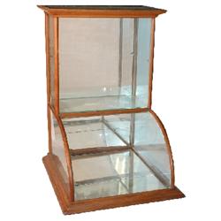 Single tower curved glass countertop showcase, oak, VG condition, 21.5"W x 32"H.