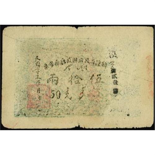 <style type="text/css"> body, td, th { font-family: Arial, Helvetica, sans-serif; font-size: 12px; color: #482424; margin: 0px; padding: 0px; } #header { background-image: url(http://www.bowersandmerena.com/ebay/images/template_v3_01.gif); clear: both; background-color: #590303; border-top-width: 2px; border-top-style: solid; border-top-color: #B38C4F; } #header #header_wrapper { height: 75px; clear: both; width: 800px; margin-right: auto; margin-left: auto; background-image: url(http://www.bowersandmerena.com/ebay/images/template_v3_03.gif); background-repeat: no-repeat; background-position: right; color: #F3EDCC; } #header #header_wrapper #header_logo { float: left; height: 75px; width: 444px; background-image: url(http://www.bowersandmerena.com/ebay/images/template_v3_02.gif); background-repeat: no-repeat; font-size: 10px; text-transform: capitalize; color: #B38C4F; } #header #header_wrapper #header_right { float: left; height: 75px; width: 356px; text-align: right; } #header #header_wrapper #header_right #headerLoginBtn { margin-bottom: 30px; } #header #header_wrapper #header_right input#txtSearch { color: #B49056; border: 1px solid #B49056; width: 175px; padding-top: 3px; padding-right: 3px; padding-bottom: 4px; padding-left: 3px; } #nav { height: 37px; background-image: url(http://www.bowersandmerena.com/ebay/images/template_v3_05.gif); clear: both; } #nav #nav_wrapper { height: 35px; width: 800px; margin-right: auto; margin-left: auto; border-left-width: 1px; border-left-style: solid; border-left-color: #B38C4F; } #nav #nav_wrapper a { padding-right: 15px; padding-left: 15px; border-right-width: 1px; border-right-style: solid; border-right-color: #B38C4F; height: 25px; padding-top: 10px; display: block; float: left; text-decoration: none; font-weight: bold; color: #5D0303; } #nav #nav_wrapper a:hover { color: #B38C4F; } #nav #nav_wrapper #search { float: right; padding-top: 7px; } #nav #nav_wrapper #search #txtSearch { font-family: Arial, Helvetica, sans-serif; font-size: 10px; text-transform: uppercase; color: #D2AE75; border: 1px solid #B38C4F; padding: 3px; } #content_bgd { background-image: url(http://www.bowersandmerena.com/ebay/images/template_v3_09.gif); background-repeat: repeat-y; background-position: center; padding-top: 15px; padding-bottom: 15px; background-color: #FBFBDB; } #content_wrapper { clear: both; height: auto; width: 800px; margin-right: auto; margin-left: auto; } .LotDetailWhite { line-height:normal; font-size:13px; font-family: arial,helvetica,sans-serif; color: White; font-weight: bold; } .LotDetailInformation { line-height:normal; font-size: 13px; font-family: arial,helvetica,sans-serif; } .LotDetailMessage { line-height:normal; font-size: 13px; font-family: arial,helvetica,sans-serif; color: red; } } tr.HeaderAuctionTitle td { color: #000000; font-weight: bold; padding: 2px; background-image: url(http://www.bowersandmerena.com/ebay/images/template_v3_05.gif); background-repeat: repeat-x; border-bottom-width: 1px; border-bottom-style: solid; border-bottom-color: #B38C4F; } table.AuctionSummary a, table.AuctionSummary a:link, table.AuctionSummary a:visited { color: #0000FF; text-decoration: none; } } td.tableHeaderLeft { border-left-width: 1px; border-left-style: solid; border-left-color: #B38C4F; } td.tableHeaderRight { border-right-width: 1px; border-right-style: solid; border-right-color: #B38C4F; } td.tableCellMiddle { border-left-width: 1px; border-left-style: solid; border-left-color: #B38C4F; border-right-width: 1px; border-right-style: solid; border-right-color: #B38C4F; padding: 5px; } tr.footer td { border-top-width: 1px; border-top-style: solid; border-top-color: #B38C4F; } </style> </head> <body> <div id="header"> <div id="header_wrapper"> <div id="header_logo"> </div> <div id="header_right"> </div> </div> </div> <div id="nav"> <div id="nav_wrapper"> <a href="http://www.bowersandmerena.com">Our eBayLive Auctions</a> <a href="#PaymentInfo">Payment Information</a> <a href="#ShippingInfo">Shipping Information</a> <a href="#About">About Bowers and Merena</a> </div> </div> <div id="content_bgd"> <div id="content_wrapper"> <table width="100%" border="0" cellpadding="5" cellspacing="0" class="AuctionSummary"> <tbody> <tr class="HeaderAuctionTitle" style="height: 25px;"> <td align="left" class="tableHeaderLeft" > </td> <td align="center" class="tableHeaderRight"> <span style="font-size: large;">Lot #904. Private, Local and Misc. Banks and Issuers. Sinkiang Sub-Prefecture Administration Finance Department Treasury--Official Note.</span> </td> </tr> <tr> <td colspan="3" class="tableCellMiddle"> Sinkiang Province, 1936, 50 Tael, P-S1780F, VF, scarce note in this condition.