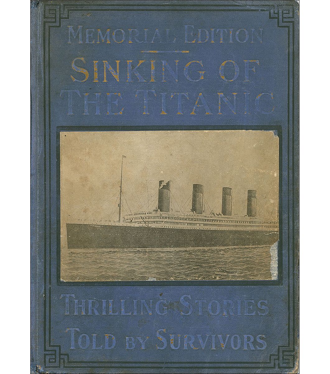 Two hardcover copies, one blue and one green, of the Sinking of the Titanic: Thrilling Stories Told by Survivors, Memorial Editions, by J. Henry Mowbry, Minter Co., Harrisburg, 1912. Both copies feature an artist’s rendition of the Olympic as the Titanic on the cover. Both copies have loose, but intact hinges, and green cover has sunning along the spine and left and bottom edge of the front. Accompanied by several vintage clippings regarding the Titanic.
