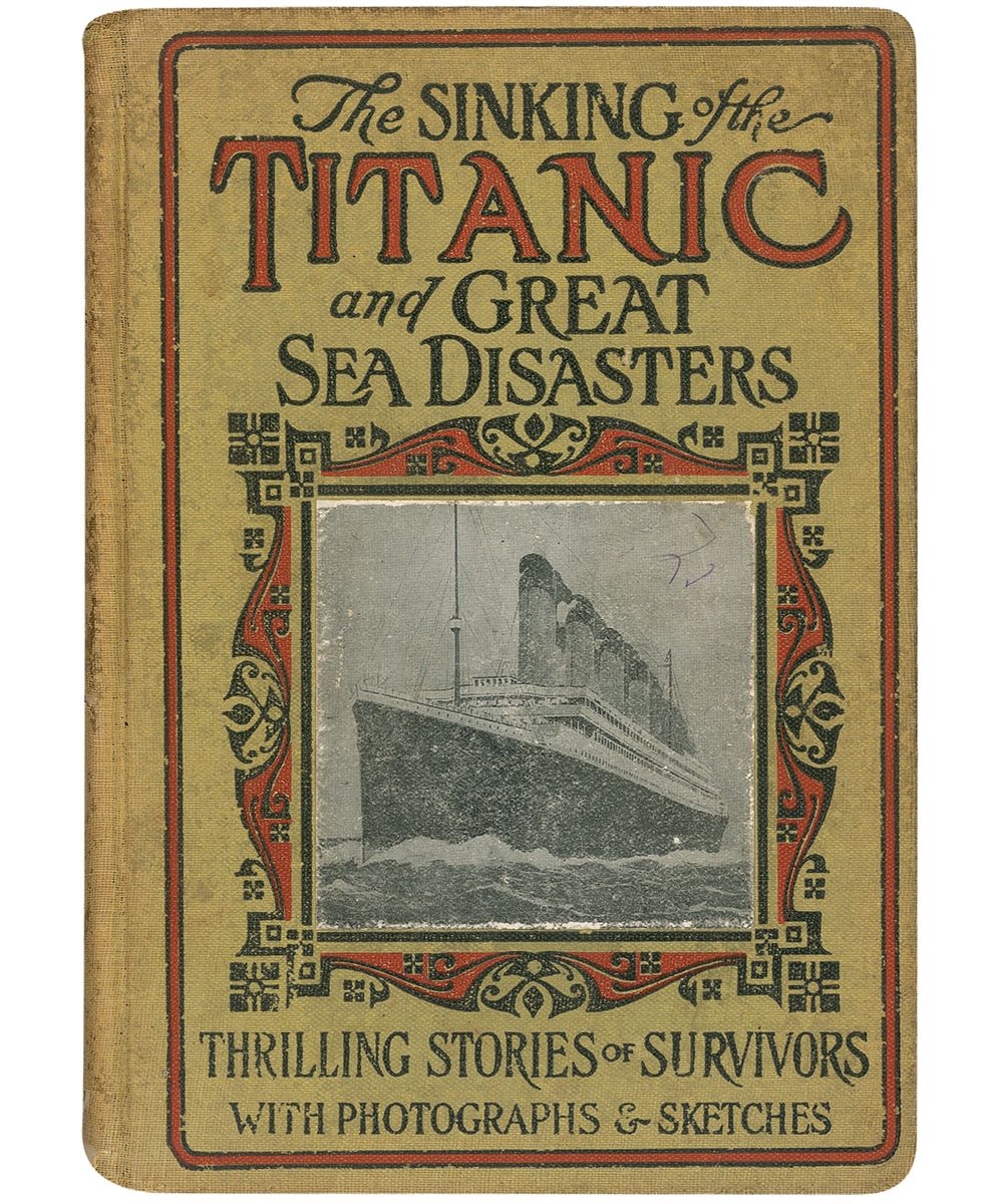 The Sinking of the Titanic and Great Sea Disasters [Prospectus] by Logan Marshall. Salesman sample. Philadelphia: American Book and Bible House, 1912. Yellow hardcover, 6.25 x 9. First page is a “Notice to Agents,” in part: “This Prospectus is hastily prepared and is only intended to indicate what the complete book will be…Only a portion of the interesting photographs and artists’ drawings are shown in this sample book.” Bears no page numbers and chapters are incomplete excerpts; final eight pages consist of order forms for the final book, which were filled out by the original salesman in pencil. In very good condition, with scattered toning and soiling to covers, an ink notation to image on front cover, a few tears to pages, and rubbing to edges and spine.