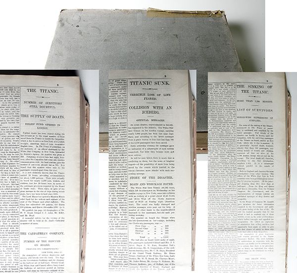 Sinking of the Titanic. the Times, London, Monday, April 2-Saturday, June 29, 1912. Nos. 39,861-39,938, 77 issues, full folio, bound in one volume. (24 3/8 x 19 in.; 610 x 500 mm.). Missing first eight pages of April 2nd issue and two pages of the June 29th issue, affecting no Titanic reports. Few occasional short tears mended, papers clean and white with none of the browning normally seen contemporary U.S. newsprint. Boards worn and loose. Altogether a very fine volume.