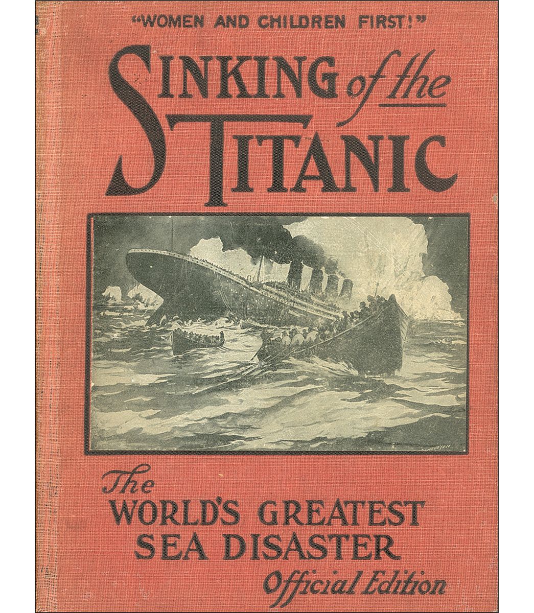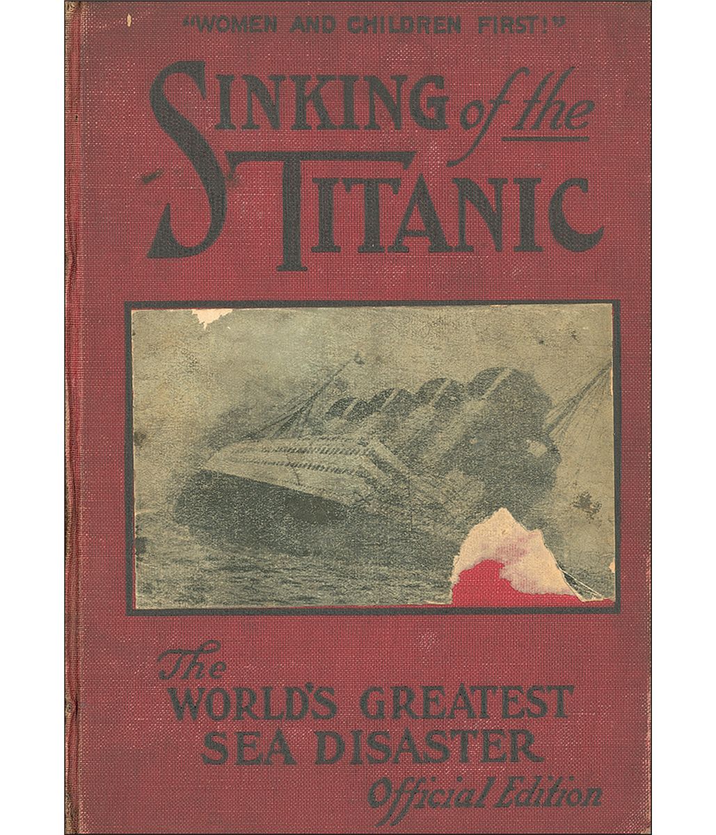 Two red hardcover copies of the Sinking of the Titanic and The Worlds Greatest Sea Disaster, Official Edition, National Bible House, Chicago, 1912, the first by Thomas Russell, and the second by Marshall Everett. The first book features an artist’s rendition of the Titanic listing to port, bearing the imprint across the top of the cover, “Women and Children First!” The second copy’s rendition captures the sinking ship with its stern up, featuring the imprint “Women and Children First!” Both featuring a “Price $1.00” imprint on the spine. Both books exhibit cracked hinges.