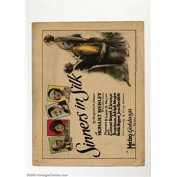 Sinners in Silk (MGM, 1924). Title Lobby Card (11" X 14"). What a great title and image for this pre-code silent drama. This Lobby Card depicts a young woman (with a dramatically dipping bustline) and a heart tattooed on her breast.This lovely silent Lobby Card pictures a young Hedda Hopper before she became one of the most powerful women in Hollywood with her newspaper gossip column. The film's tagline was "Here is the truth about today's flappers and lounge lizards!" The drama also starred a young Adolph Menjou and Jean Hersholt. Fine. Important notice: Heritage usually auctions material at the rate of 200-250 lots per hour. On some occasions eBay Live bid software or the Internet may not be able to keep up with the pace of the auction. We recommend placing a realistic absentee bid now as insurance to avoid disappointment. Occasionally the auctioneer may eliminate or reject an eBay Live bid, and the auctioneer may also reopen a lot after the close of the eBay live bidding (usually because we missed an audience bid), and may reject your bid even if it shows you as the winning bidder. By bidding via eBay Live, you agree that Heritage may award the lot to another bidder at its sole discretion under the circumstances described above or any other reasonable circumstances. Also please note that all Heritage lots purchased through eBay Live carry a 20% Buyer's Premium. Please make sure you read the Terms and Conditions before you bid.