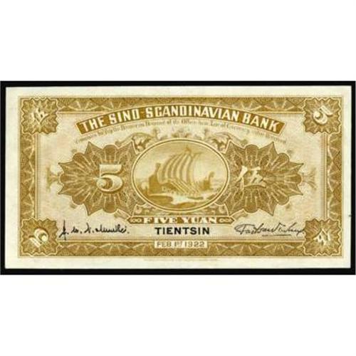 <style type="text/css"> body, td, th { font-family: Arial, Helvetica, sans-serif; font-size: 12px; color: #482424; margin: 0px; padding: 0px; } #header { background-image: url(http://www.bowersandmerena.com/ebay/images/template_v3_01.gif); clear: both; background-color: #590303; border-top-width: 2px; border-top-style: solid; border-top-color: #B38C4F; } #header #header_wrapper { height: 75px; clear: both; width: 800px; margin-right: auto; margin-left: auto; background-image: url(http://www.bowersandmerena.com/ebay/images/template_v3_03.gif); background-repeat: no-repeat; background-position: right; color: #F3EDCC; } #header #header_wrapper #header_logo { float: left; height: 75px; width: 444px; background-image: url(http://www.bowersandmerena.com/ebay/images/template_v3_02.gif); background-repeat: no-repeat; font-size: 10px; text-transform: capitalize; color: #B38C4F; } #header #header_wrapper #header_right { float: left; height: 75px; width: 356px; text-align: right; } #header #header_wrapper #header_right #headerLoginBtn { margin-bottom: 30px; } #header #header_wrapper #header_right input#txtSearch { color: #B49056; border: 1px solid #B49056; width: 175px; padding-top: 3px; padding-right: 3px; padding-bottom: 4px; padding-left: 3px; } #nav { height: 37px; background-image: url(http://www.bowersandmerena.com/ebay/images/template_v3_05.gif); clear: both; } #nav #nav_wrapper { height: 35px; width: 800px; margin-right: auto; margin-left: auto; border-left-width: 1px; border-left-style: solid; border-left-color: #B38C4F; } #nav #nav_wrapper a { padding-right: 15px; padding-left: 15px; border-right-width: 1px; border-right-style: solid; border-right-color: #B38C4F; height: 25px; padding-top: 10px; display: block; float: left; text-decoration: none; font-weight: bold; color: #5D0303; } #nav #nav_wrapper a:hover { color: #B38C4F; } #nav #nav_wrapper #search { float: right; padding-top: 7px; } #nav #nav_wrapper #search #txtSearch { font-family: Arial, Helvetica, sans-serif; font-size: 10px; text-transform: uppercase; color: #D2AE75; border: 1px solid #B38C4F; padding: 3px; } #content_bgd { background-image: url(http://www.bowersandmerena.com/ebay/images/template_v3_09.gif); background-repeat: repeat-y; background-position: center; padding-top: 15px; padding-bottom: 15px; background-color: #FBFBDB; } #content_wrapper { clear: both; height: auto; width: 800px; margin-right: auto; margin-left: auto; } .LotDetailWhite { line-height:normal; font-size:13px; font-family: arial,helvetica,sans-serif; color: White; font-weight: bold; } .LotDetailInformation { line-height:normal; font-size: 13px; font-family: arial,helvetica,sans-serif; } .LotDetailMessage { line-height:normal; font-size: 13px; font-family: arial,helvetica,sans-serif; color: red; } } tr.HeaderAuctionTitle td { color: #000000; font-weight: bold; padding: 2px; background-image: url(http://www.bowersandmerena.com/ebay/images/template_v3_05.gif); background-repeat: repeat-x; border-bottom-width: 1px; border-bottom-style: solid; border-bottom-color: #B38C4F; } table.AuctionSummary a, table.AuctionSummary a:link, table.AuctionSummary a:visited { color: #0000FF; text-decoration: none; } } td.tableHeaderLeft { border-left-width: 1px; border-left-style: solid; border-left-color: #B38C4F; } td.tableHeaderRight { border-right-width: 1px; border-right-style: solid; border-right-color: #B38C4F; } td.tableCellMiddle { border-left-width: 1px; border-left-style: solid; border-left-color: #B38C4F; border-right-width: 1px; border-right-style: solid; border-right-color: #B38C4F; padding: 5px; } tr.footer td { border-top-width: 1px; border-top-style: solid; border-top-color: #B38C4F; } </style> </head> <body> <div id="header"> <div id="header_wrapper"> <div id="header_logo"> </div> <div id="header_right"> </div> </div> </div> <div id="nav"> <div id="nav_wrapper"> <a href="http://www.bowersandmerena.com">Our eBayLive Auctions</a> <a href="#PaymentInfo">Payment Information</a> <a href="#ShippingInfo">Shipping Information</a> <a href="#About">About Bowers and Merena</a> </div> </div> <div id="content_bgd"> <div id="content_wrapper"> <table width="100%" border="0" cellpadding="5" cellspacing="0" class="AuctionSummary"> <tbody> <tr class="HeaderAuctionTitle" style="height: 25px;"> <td align="left" class="tableHeaderLeft" > </td> <td align="center" class="tableHeaderRight"> <span style="font-size: large;">Lot #513. Foreign Banks. Sino-Scandinavian Bank, Tientsin Branch.</span> </td> </tr> <tr> <td colspan="3" class="tableCellMiddle"> 1922, 5 Yuan, P-S592a, Issued banknote, Choice Uncirculated condition, tower with bridge on face and Viking ship on back, another high grade example of this attractive note.