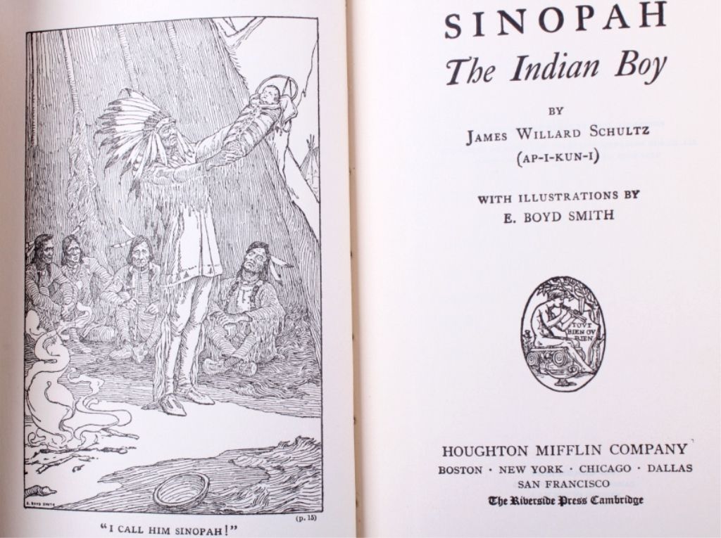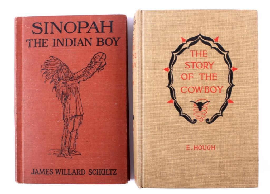 This lot features 2 collectible books, "Sinopah" and "The Story of the Cowboy". Sinopah The Indian Boy By James Willard Schultz Illustrations by E. Boyd SmithThe Riverside Press, 1913 Clean readable pages with a little tanning from age. The exterior has some wear from use and age including dings & stains. No dust jacket.Measures approximately 7 ½” x 5” x ½” The Story of the Cowboy by E. Hough D. Appleton and Company, 1924 Clean readable pages with just a littletanning from age. The exterior has some wear, mostly to the edges and corners from shelving. No dust jacket. Measures approximately 7 1/2” x 5” x 1 3/8”