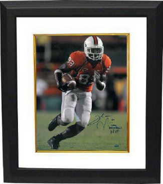 Sinorice Moss played college football at the University of Miami, where he was a standout wide receiver. He was a speedy receiver who has a knack for making big plays. Sinorice Moss has hand autographed this Miami Hurricanes 16x20 Photo with 2006 Senior Bowl MVP inscription. Moss hologram and Certificate of Authenticity from Athlon Sports. Custom White Mat and Premium Black Color Framed as shown