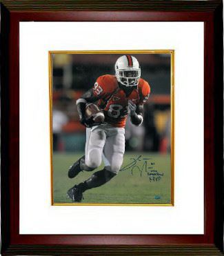 Sinorice Moss played college football at the University of Miami, where he was a standout wide receiver. He was a speedy receiver who has a knack for making big plays. Sinorice Moss has hand autographed this Miami Hurricanes 16x20 Photo with 2006 Senior Bowl MVP inscription. Moss hologram and Certificate of Authenticity from Athlon Sports. Custom White Mat and Premium Mahogany Color Framed as shown