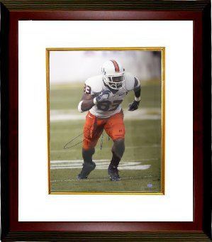 Sinorice Moss played college football at the University of Miami, where he was a standout wide receiver. He was a speedy receiver who has a knack for making big plays. Sinorice Moss has hand autographed this Miami Hurricanes 16x20 Photo. Custom White Mat and Premium Mahogany Color Frame as shown. GTSM hologram and Certificate of Authenticity from Athlon Sports.