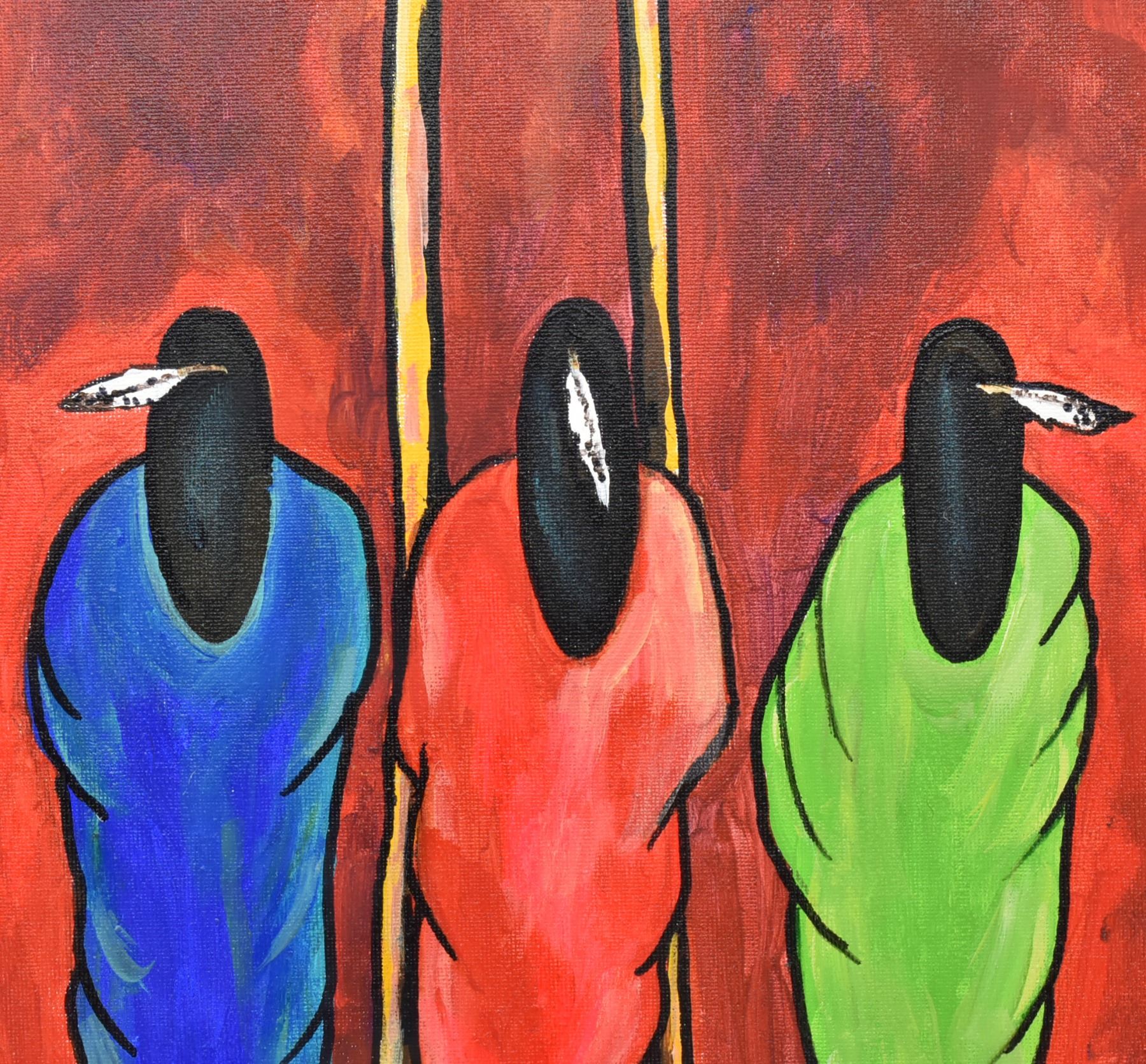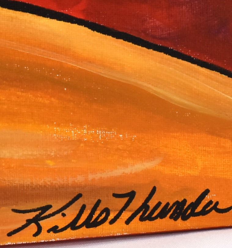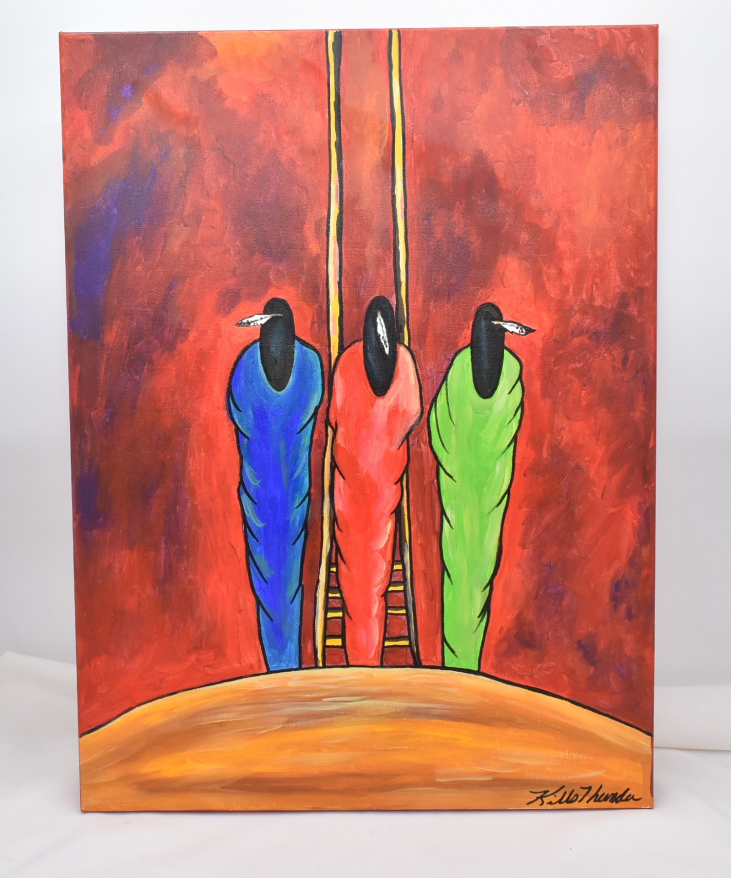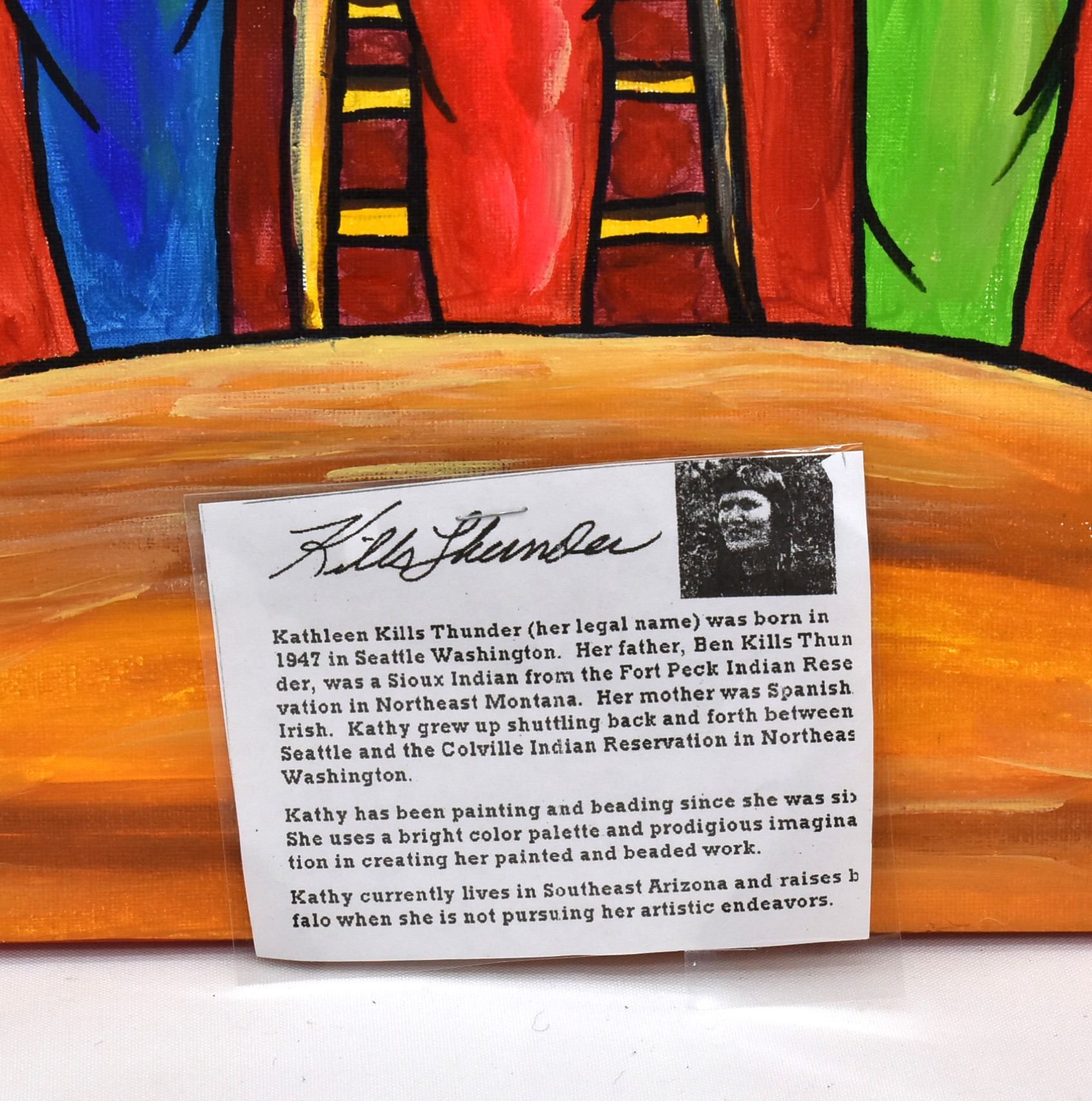 Native American Sioux Acrylic Painting ''Skyward Bound'' by Kathy Kills Thunder, measures 18'' x 24'' and is signed by the artist, Artist Bio: Kathleen Kills Thunder (her legal name) was born in 1947 in Seattle, WA. Her father, Ben Kills Thunder, was a Sioux Indian from the Fort Peck Indian Reservation in NE Montana and her mother was Spanish/Irish. Kathy has been painting and beading since she was six.