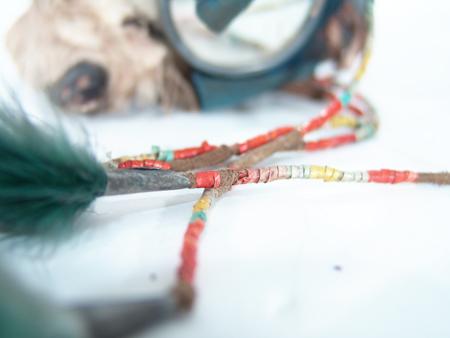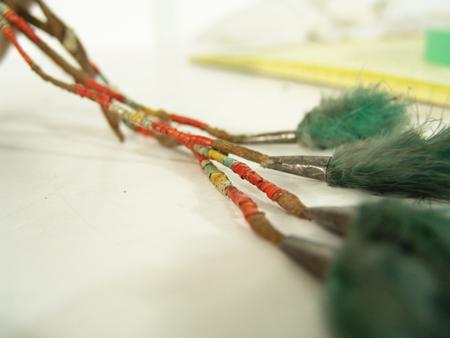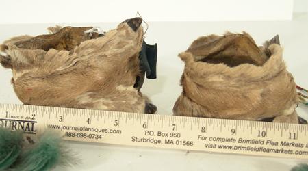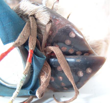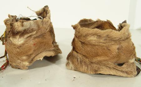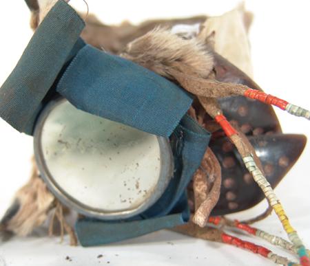 Rare pair of early deer hide bands, one with a round mirror with incised deer hooves and quilled suspensions with tin cones and feather ends. Ex: Allard collection. Purchased from Allard in 1978 for $350. 9" long