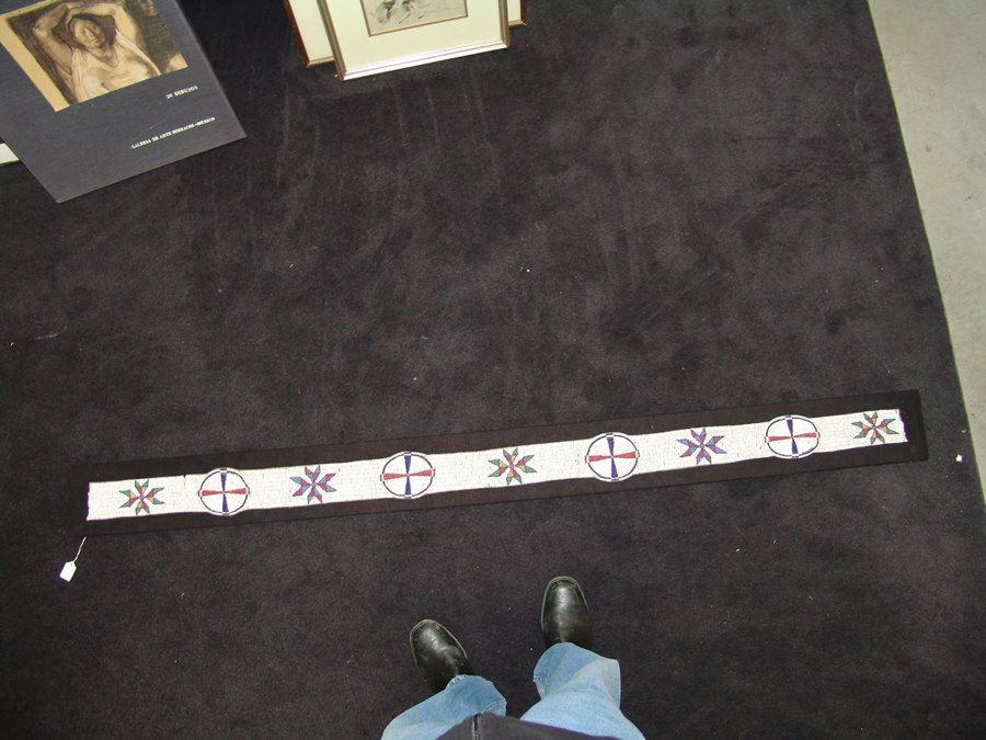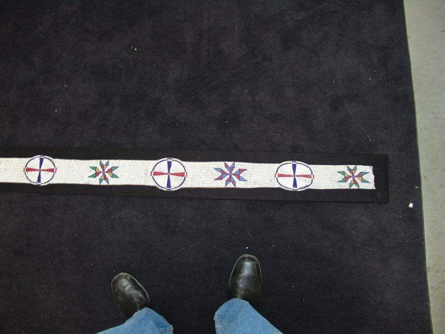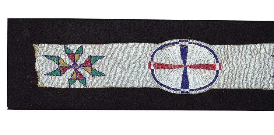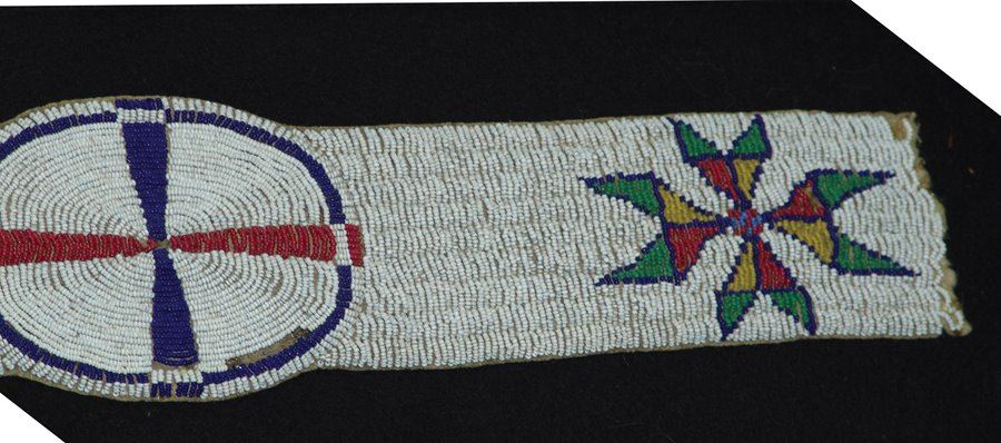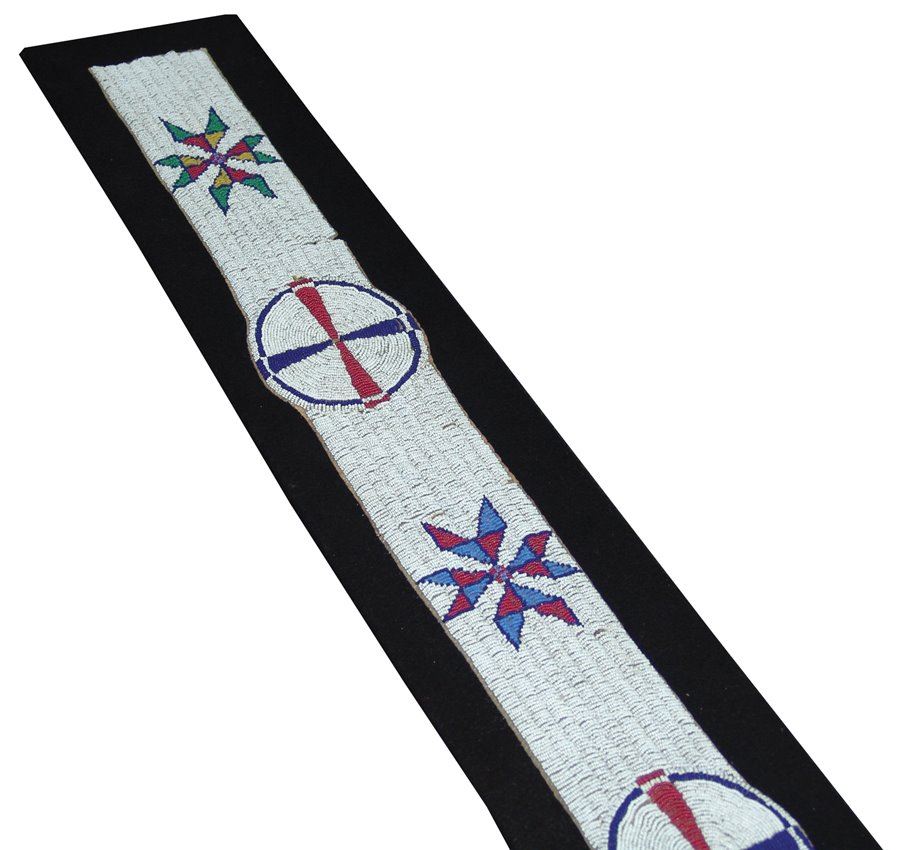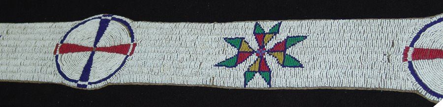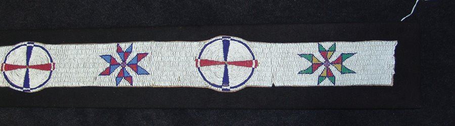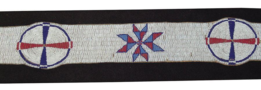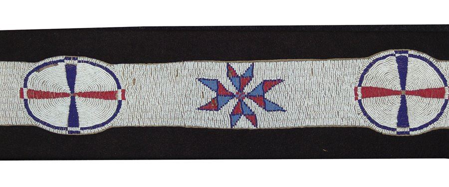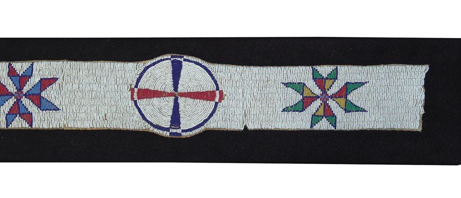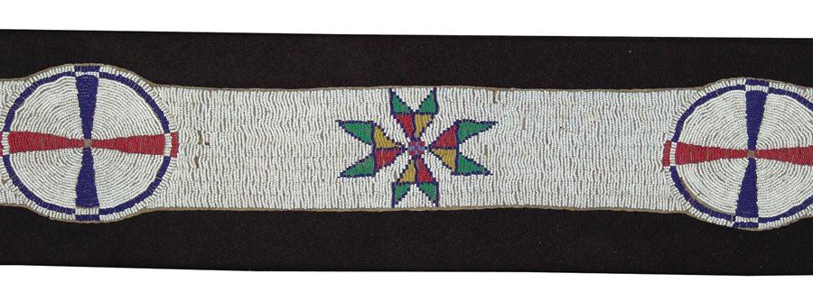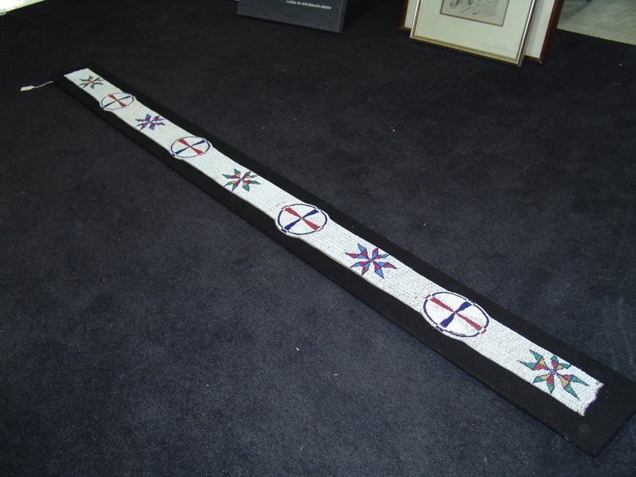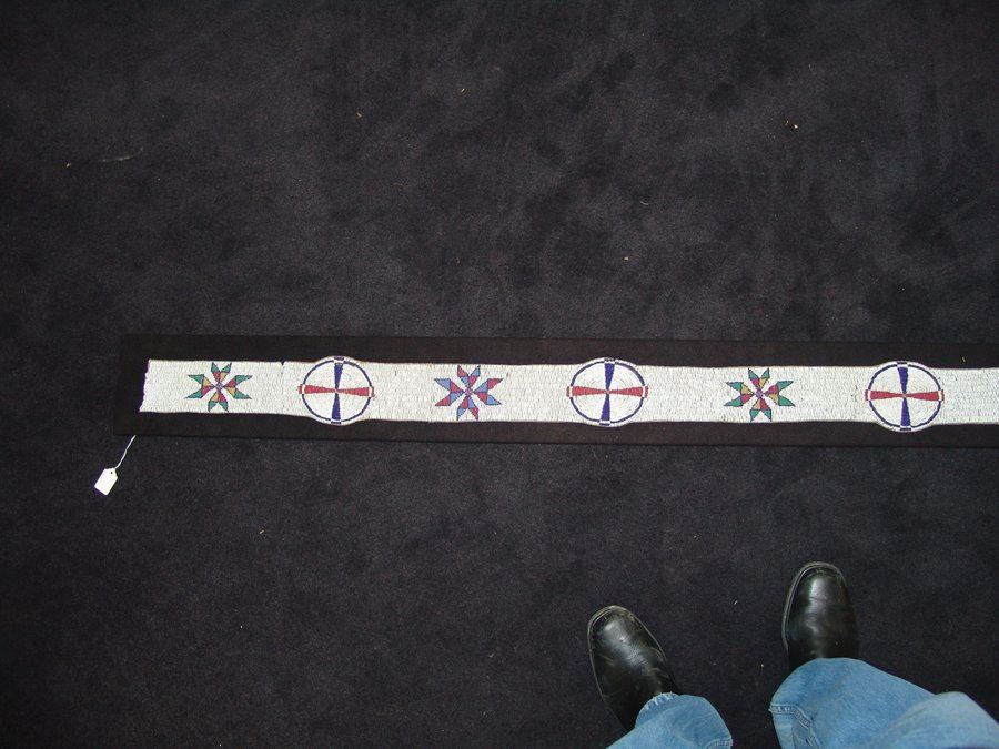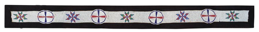 Large and historic sinew sewn and lazy stitch bead buffalo hide blanket with four rounded shields/rosettes and five, eight-point star symbols. Featured in the book. Very good condition, professional mounted.,,5" x 76"
