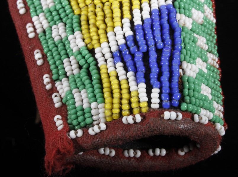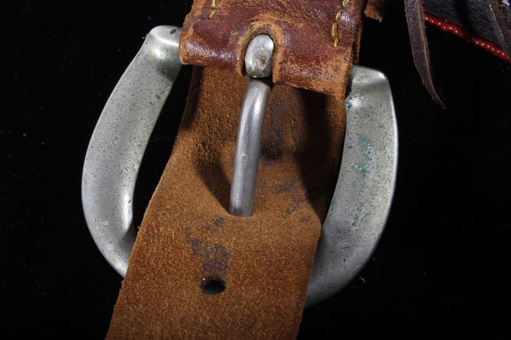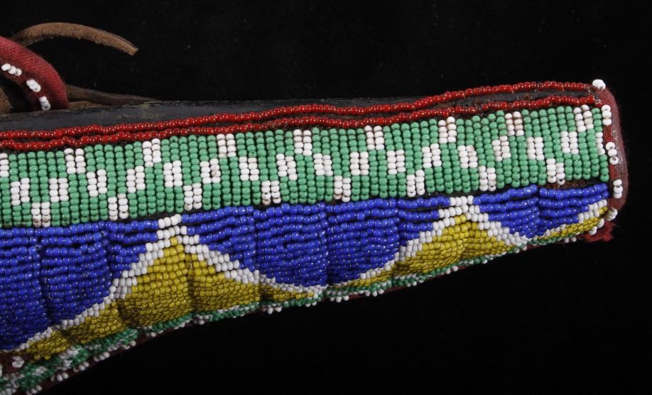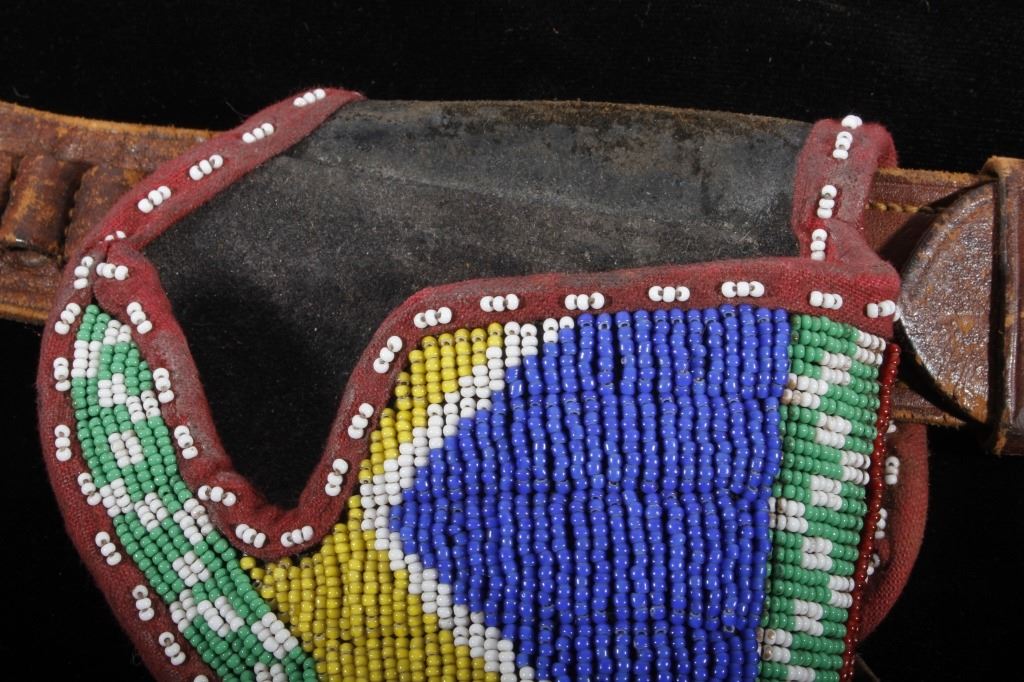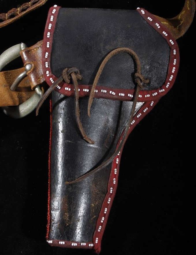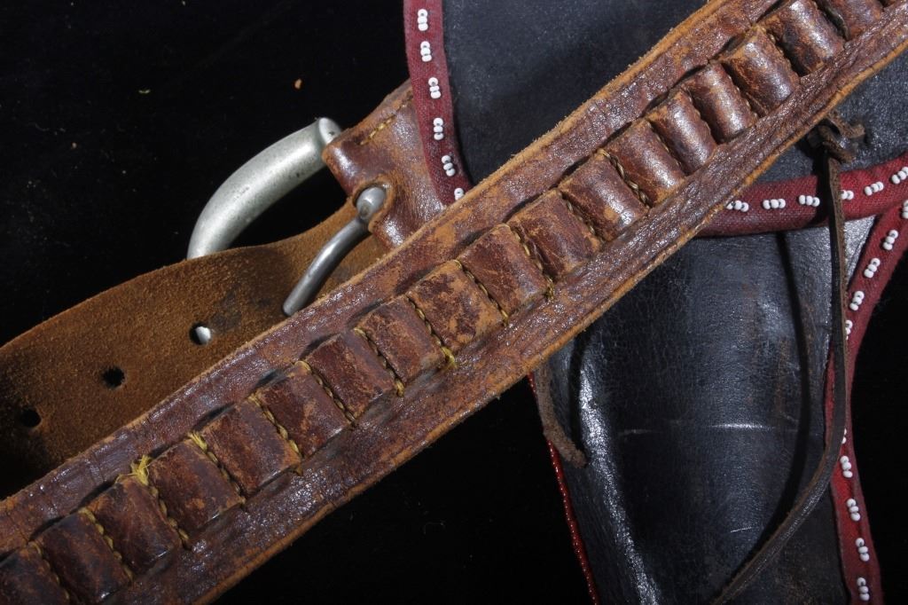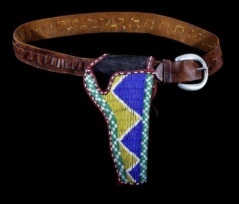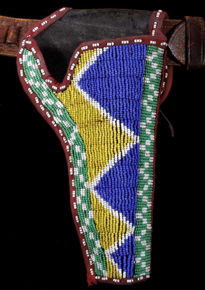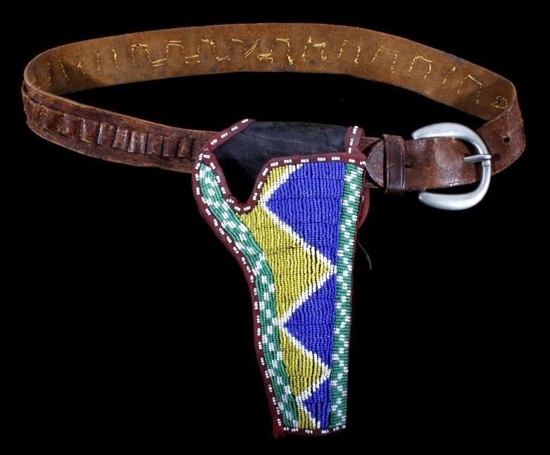 The lot features an excellent Sioux Native American Indian beaded holster for a Colt Single Action Army Revolver (SAA). The piece shows an early American Old West Cowboy holster and 1870-1880 leather ammo belt with "B.M. CO SOLID" German silver buckle. The 19th century holster is wonderfully adorned with an early red trade clothe border and glass trade seed beadwork in green, chalk white, corn yellow, blue, and semi-transparent red white hearts. The piece displays wonderful and is truly in well preserved museum quality condition. The holster is 9"L x 5.25"W. The belt is 38"L end to end.