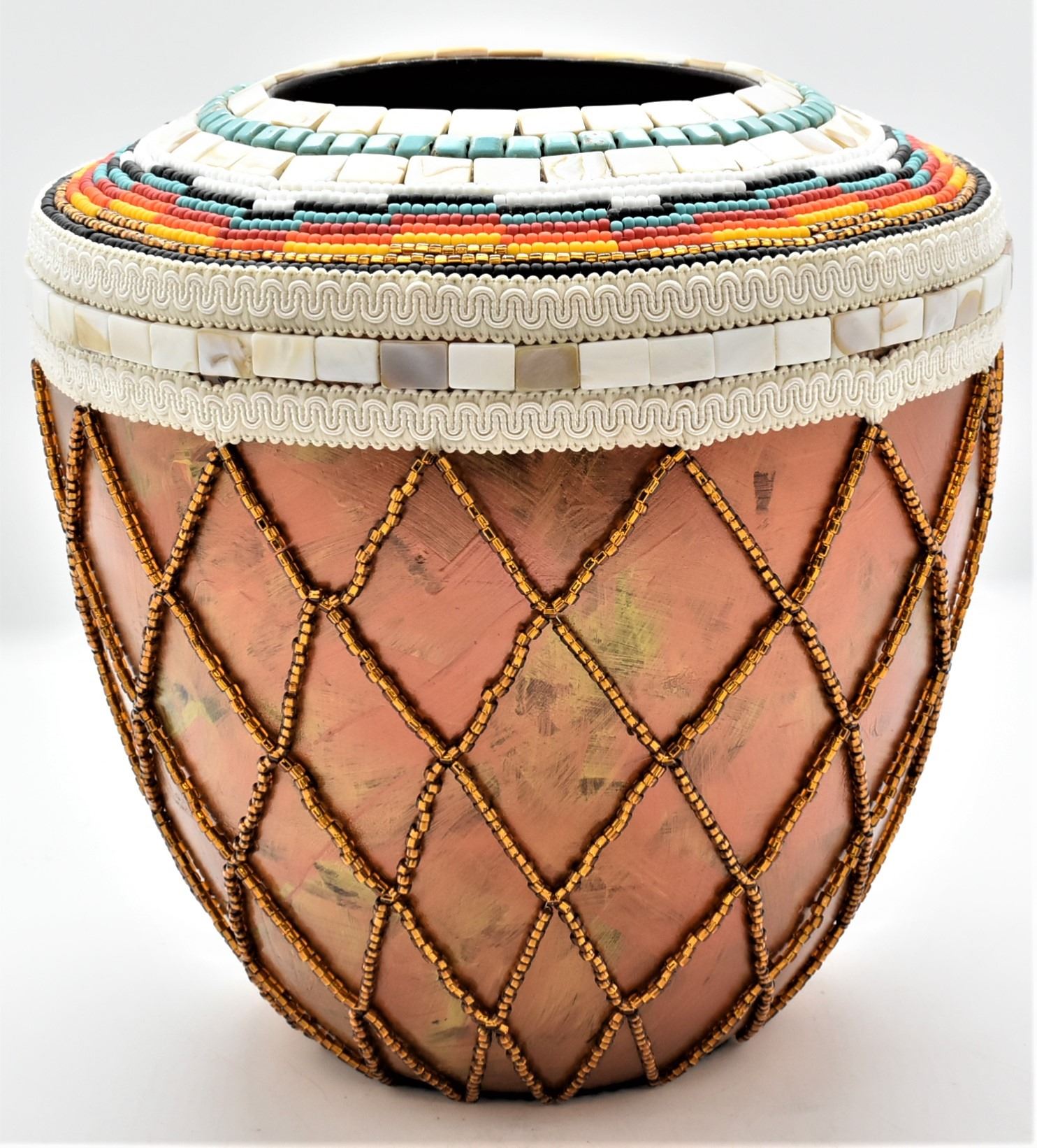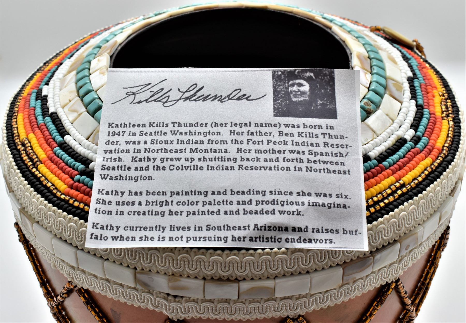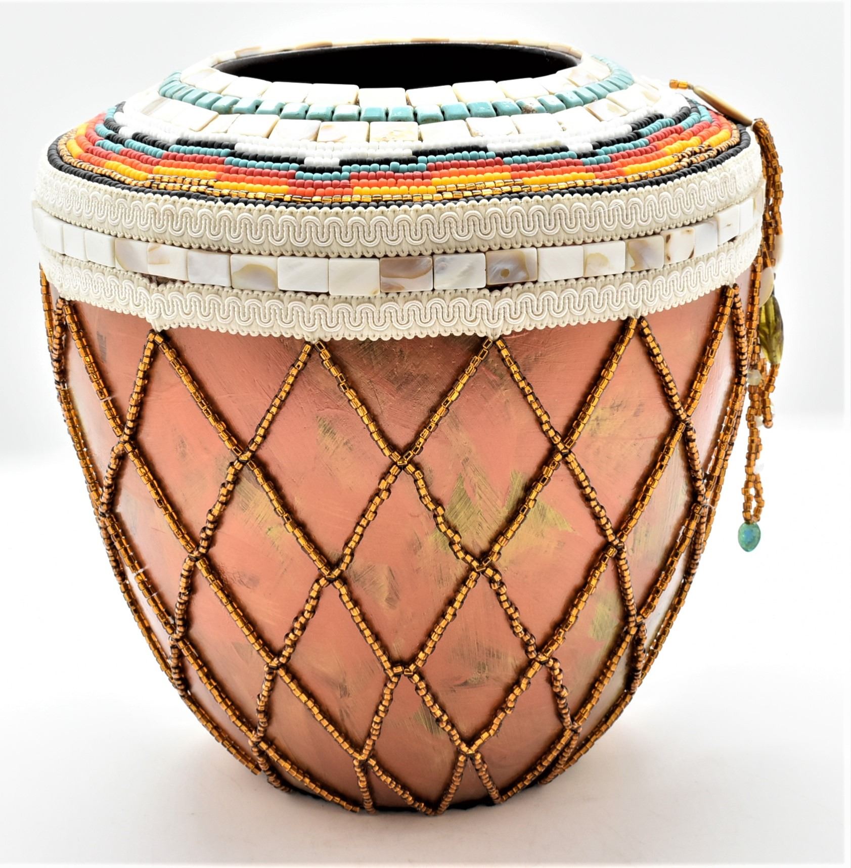 Native American Sioux Hand Beaded Composition Vase by Kathy Kills Thunder, measures 10.25'' x 10.25'', Artist Bio: Kathleen Kills Thunder (her legal name) was born in 1947 in Seattle, WA. Her father, Ben Kills Thunder, was a Sioux Indian from the Fort Peck Indian Reservation in NE Montana and her mother was Spanish/Irish. Kathy has been painting and beading since she was six.