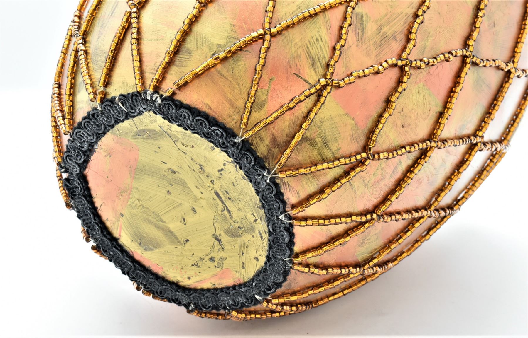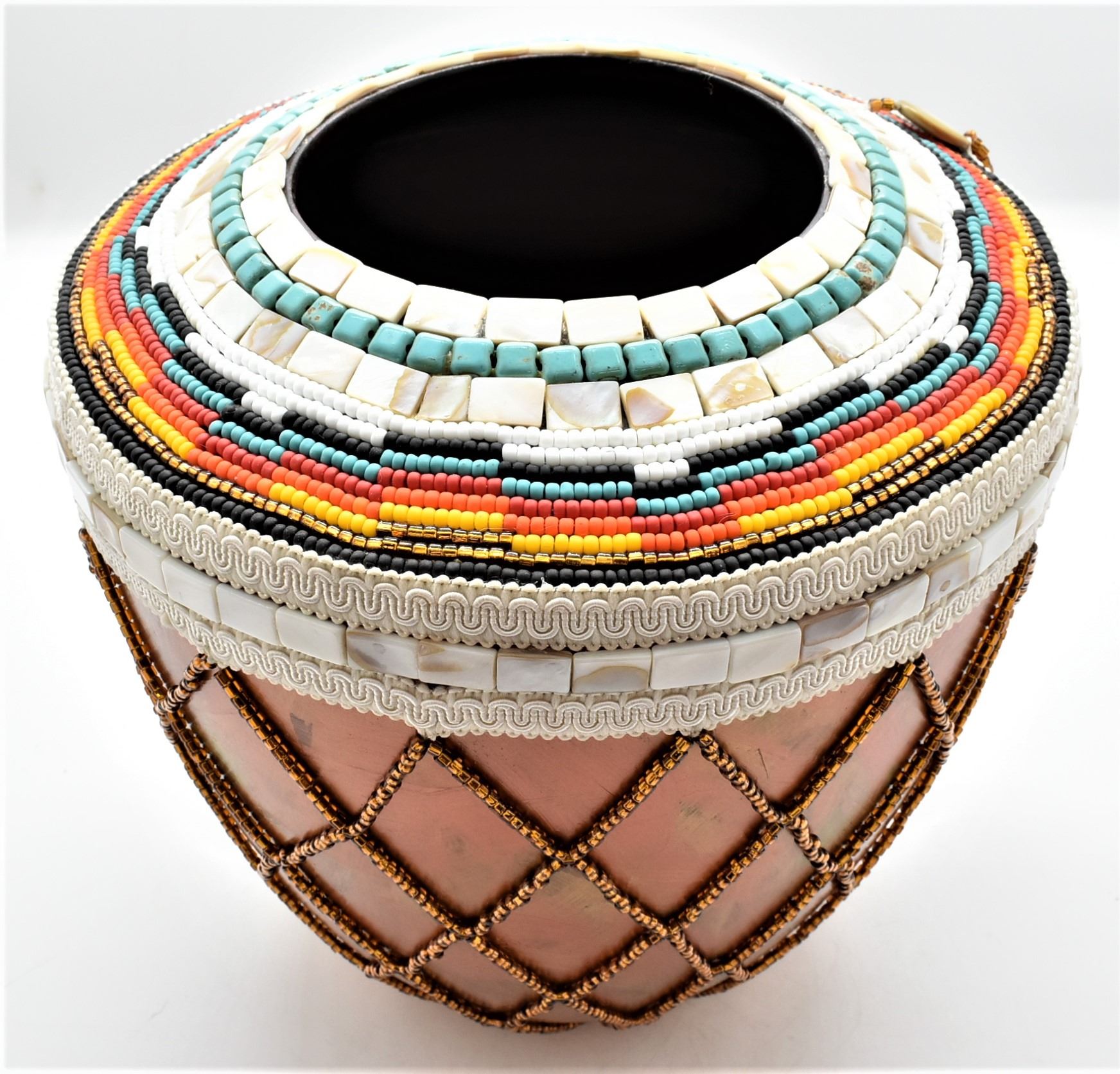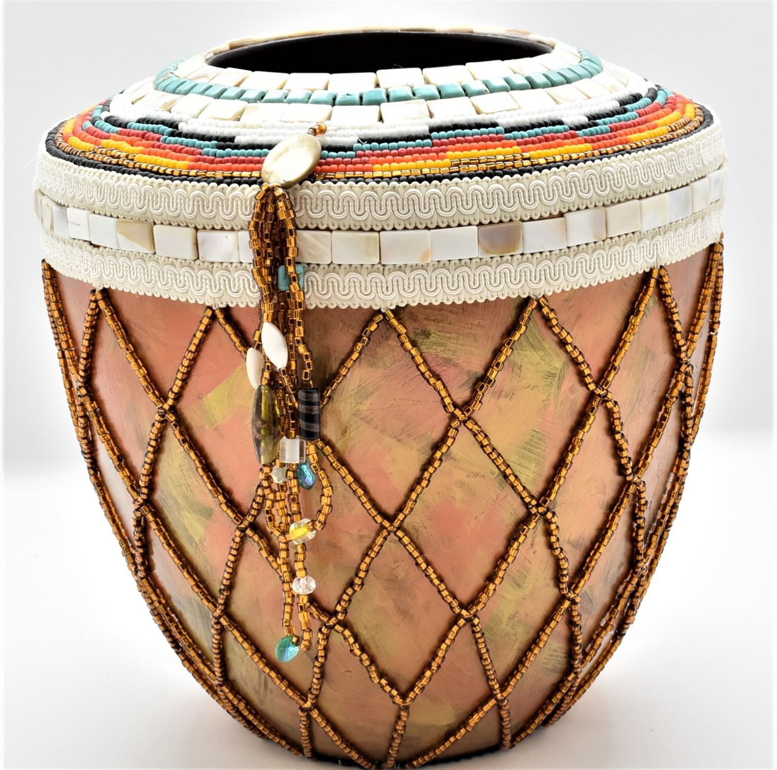 Native American Sioux Hand Beaded Composition Vase by Kathy Kills Thunder, measures 10.25'' x 10.25'', Artist Bio: Kathleen Kills Thunder (her legal name) was born in 1947 in Seattle, WA. Her father, Ben Kills Thunder, was a Sioux Indian from the Fort Peck Indian Reservation in NE Montana and her mother was Spanish/Irish. Kathy has been painting and beading since she was six.