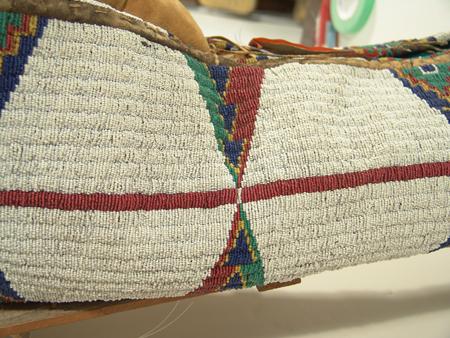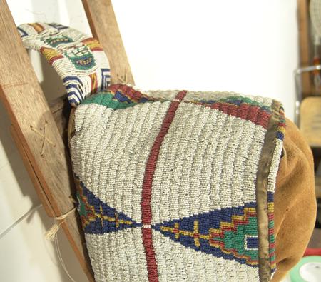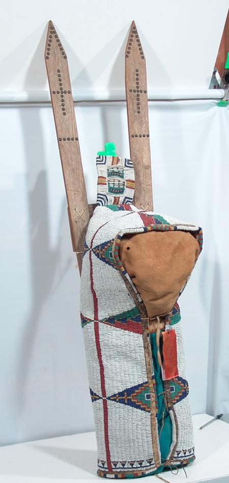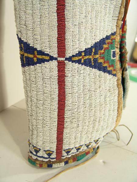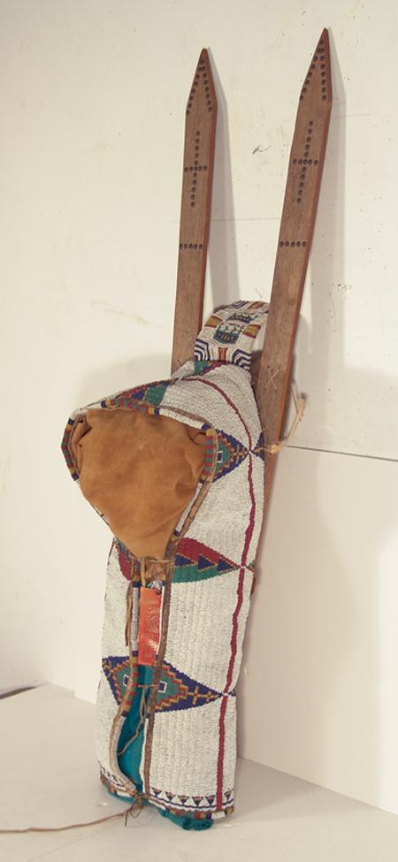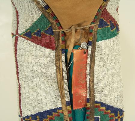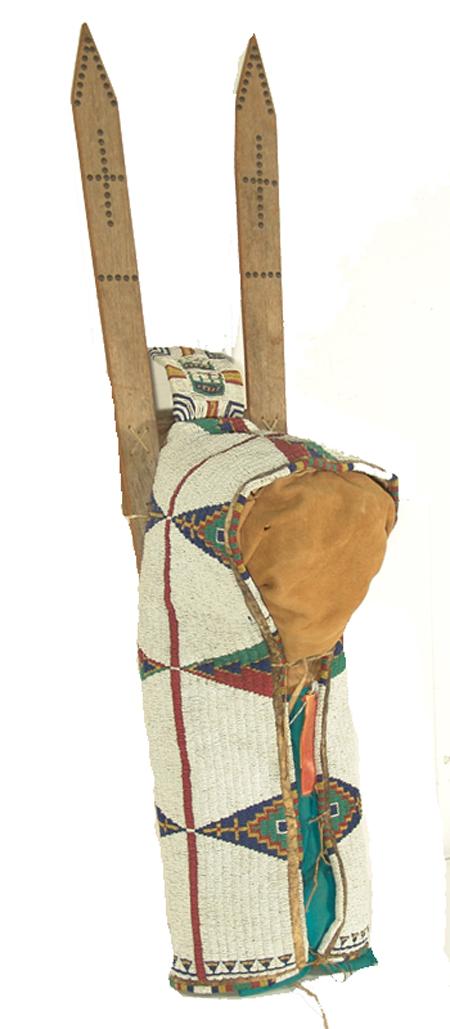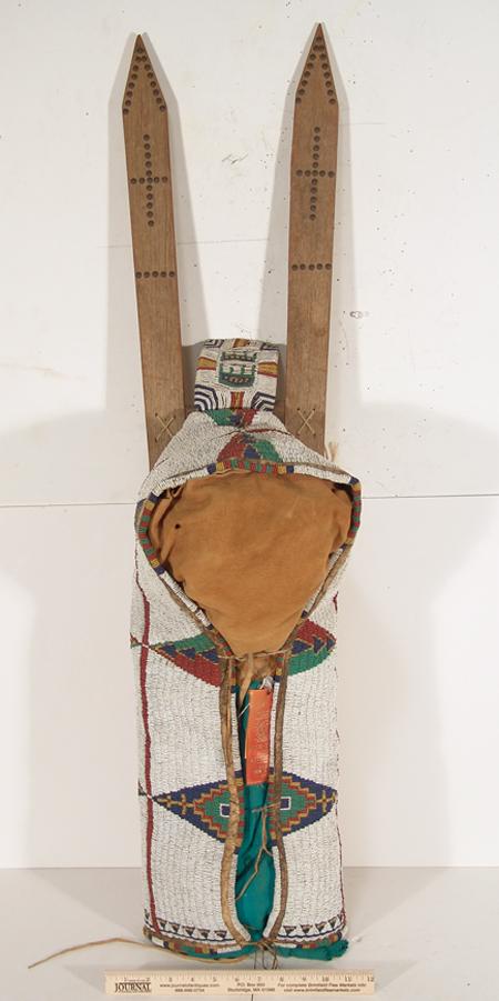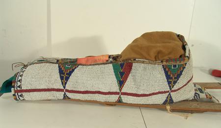 Fantastic fully beaded cradle cover with interesting geometric designs done on white ground on body and top tab - buckskin, sinew sewn, and beaded in lazy stitch. Second prize winner Gallup 1964. Purchased from Turney in 1974 for $2,700; appraisal value $