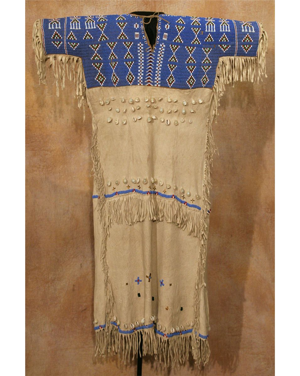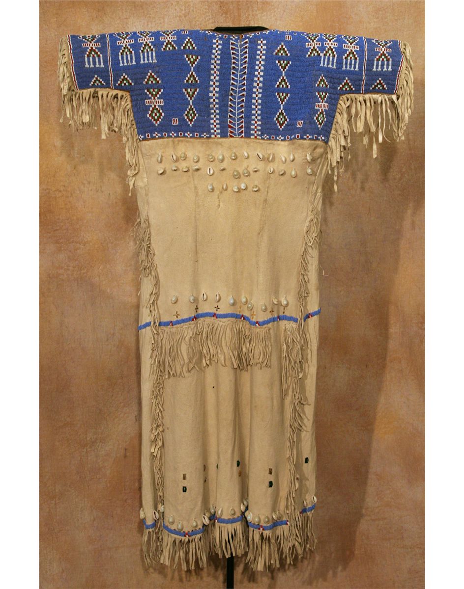Sioux Dress. 49" including 4" fringe. Older, beautifully beaded yoke on a replacement lower. Yoke is 11" x 29" at widest point. Highly decorative with lots of beads, fringe & cowry shells. 19th/20th century