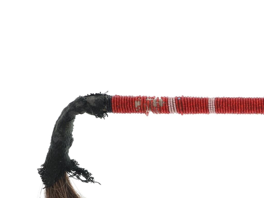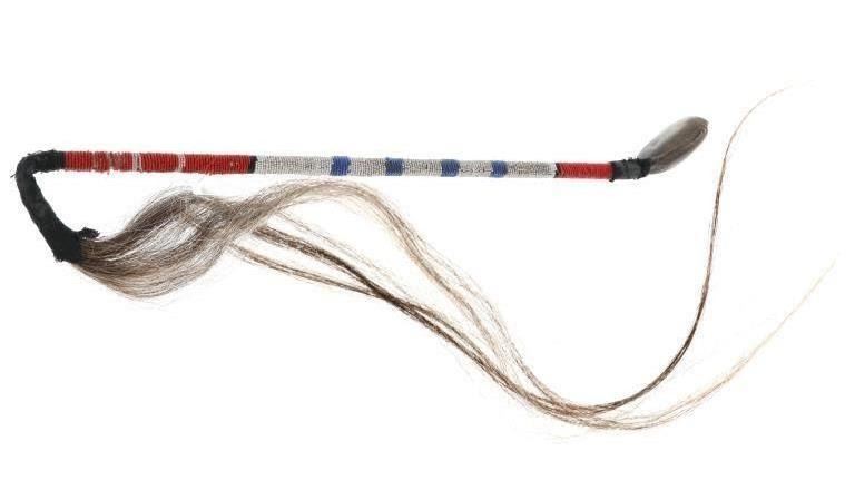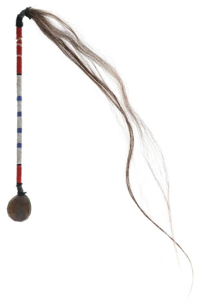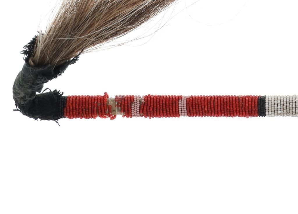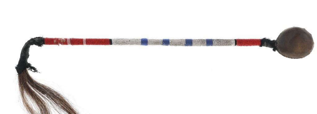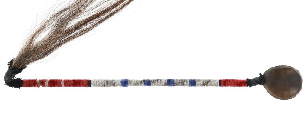 The lot features a parfleche covered stone floppy head war club with beaded shaft and horsetail hair drop from the Sioux of the 20th Century. The head shows a stone covered in parfleche rawhide, rawhide lacing sewn attached to a wood haft handle covered in hide and further covered in glass trade seed bead beadwork in a banded design. The bottom has a black stroud clothe covering with drop in horse tail hair. Beautiful look. Measures overall 24.5"L without drop which is 40"L by itself.