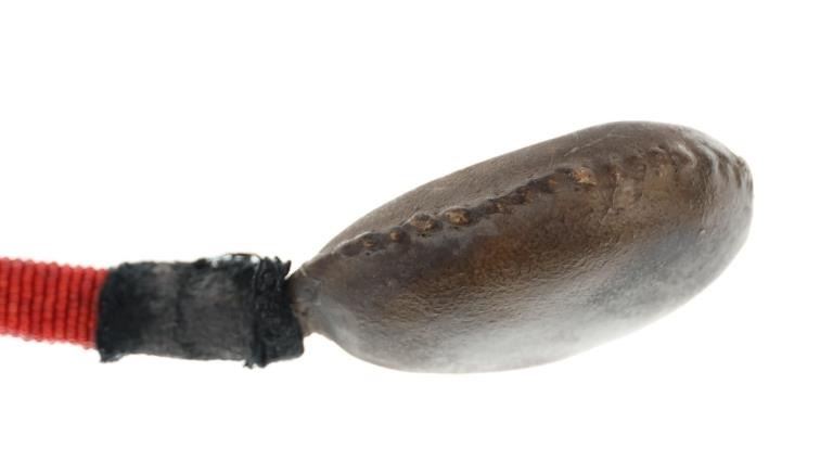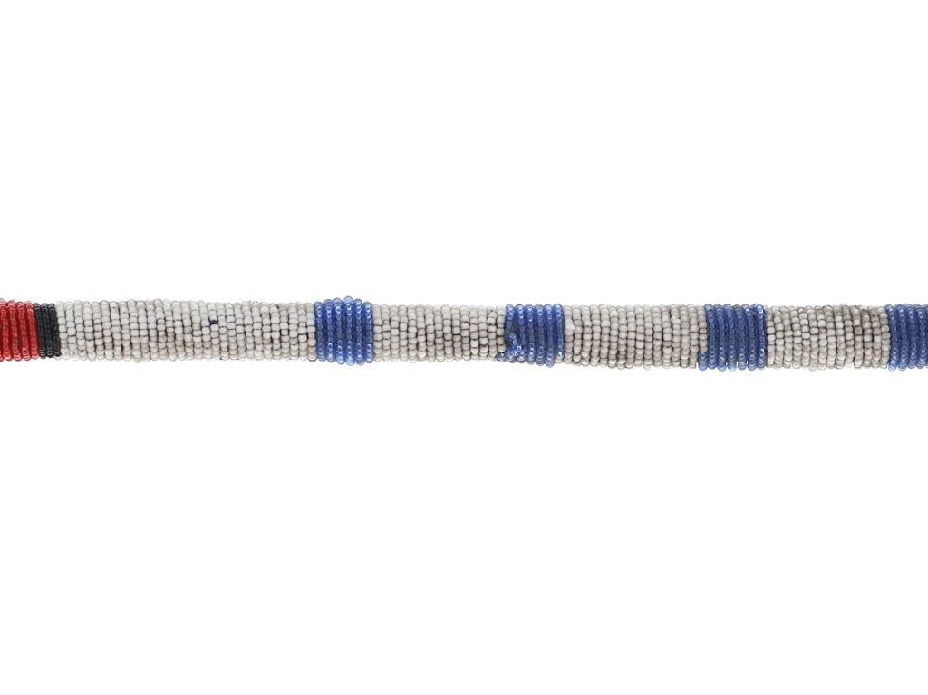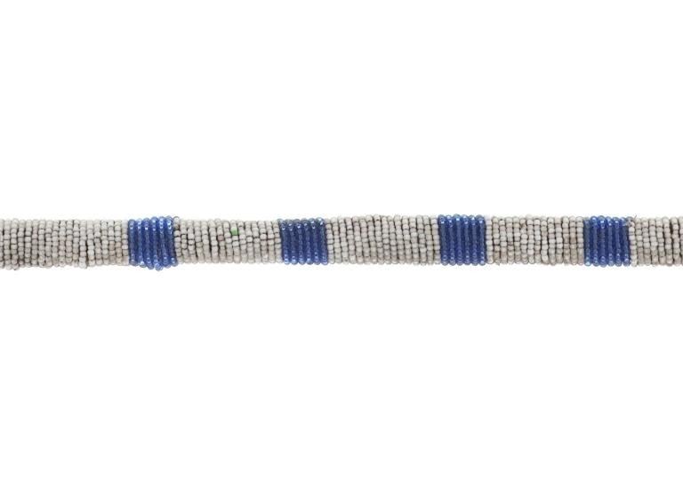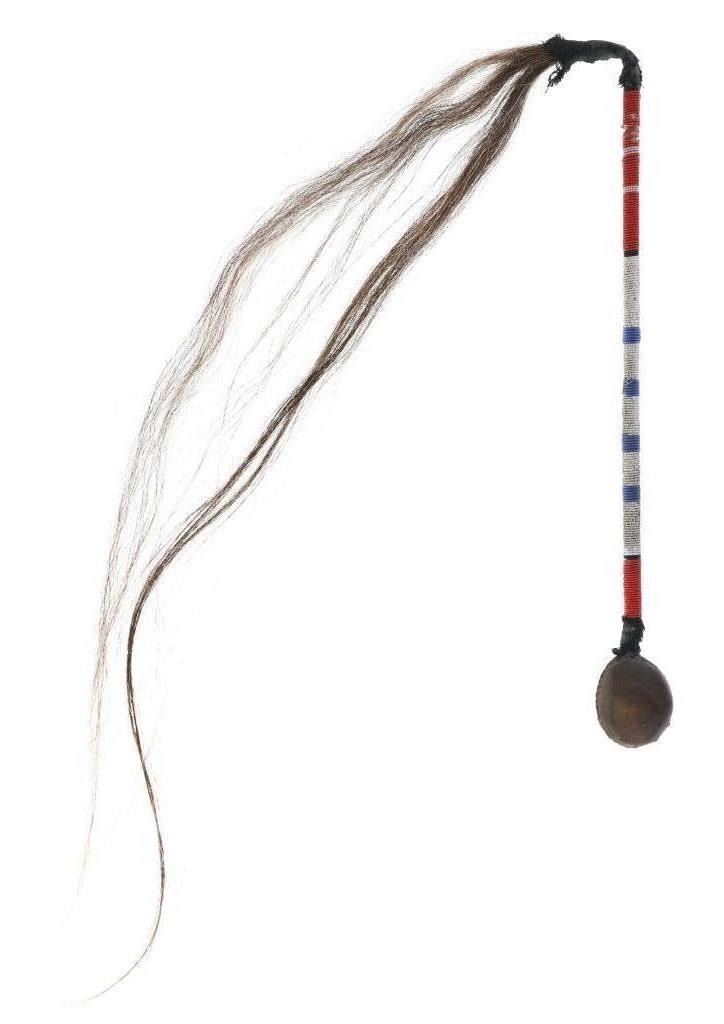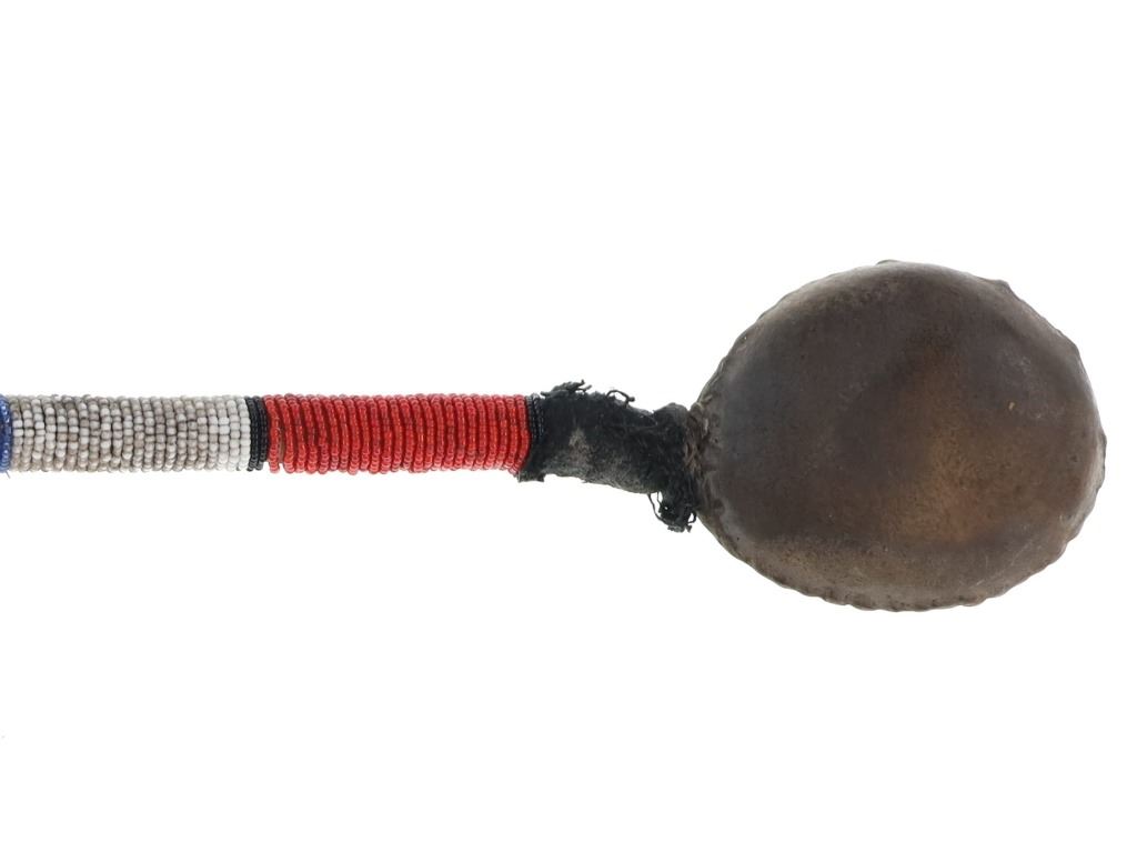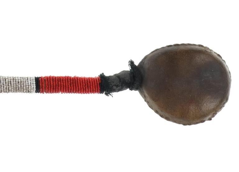 The lot features a parfleche covered stone floppy head war club with beaded shaft and horsetail hair drop from the Sioux of the 20th Century. The head shows a stone covered in parfleche rawhide, rawhide lacing sewn attached to a wood haft handle covered in hide and further covered in glass trade seed bead beadwork in a banded design. The bottom has a black stroud clothe covering with drop in horse tail hair. Beautiful look. Measures overall 24.5"L without drop which is 40"L by itself.