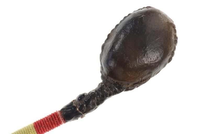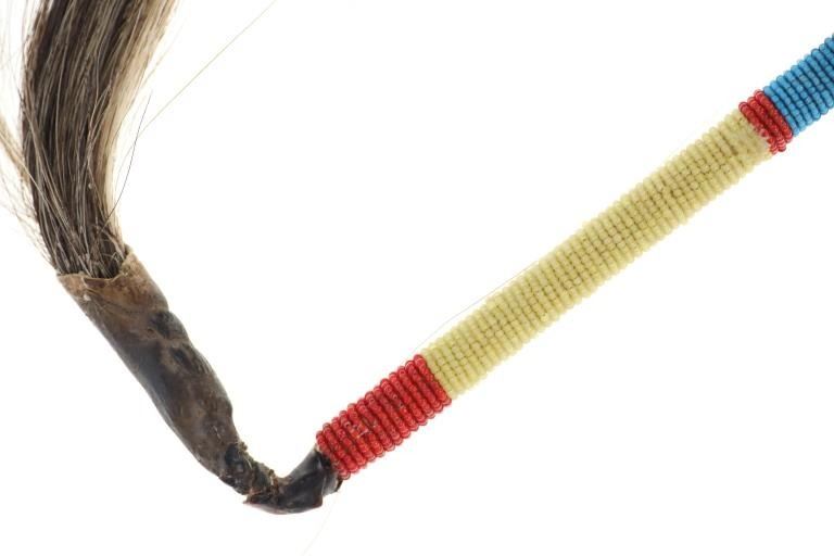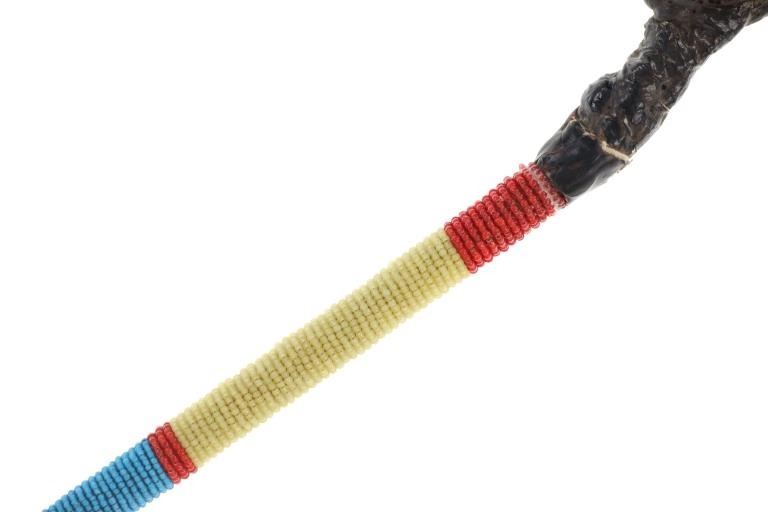 The lot features a stone head war club with beaded shaft from teh Sioux of the Northern Plains. These are often referred to as floppy stone head or skullcracker / skull cracker clubs as the stone is wrapped in hide / rawhide and attached with a section of hide / rawhide which allows the head to move freely, giving additional momentum when swung. The shaft is covered in glass trade seed beads in early colors of red white hearts, blue white hearts and greasy yellow. The club appears to be of an older age, but the hide has been covered in a glue or seal for preservation which has some cracking. Measures overall48-inches from the head to bottom of horse tail hair drop. The head is 4.5" by 2.25" by 1.25".