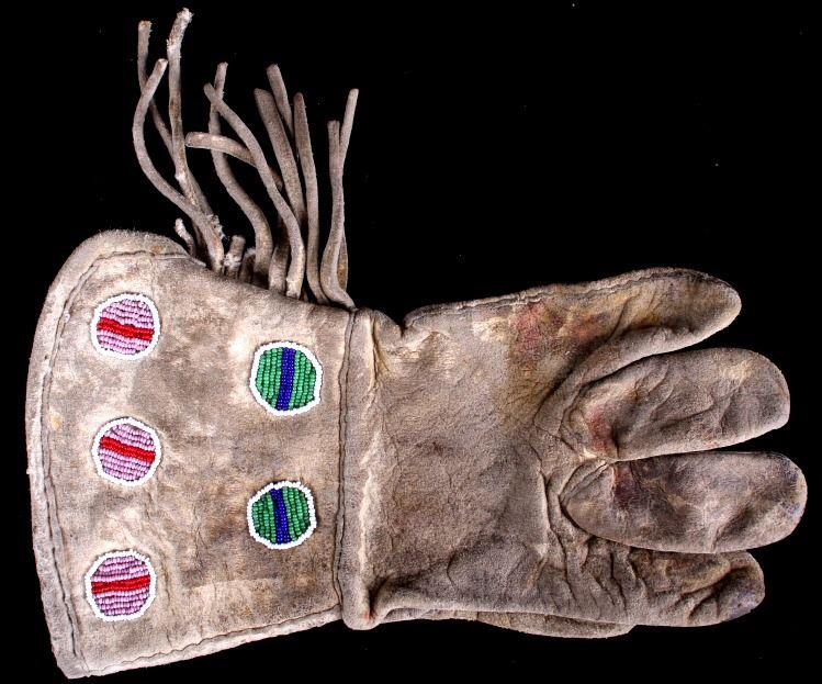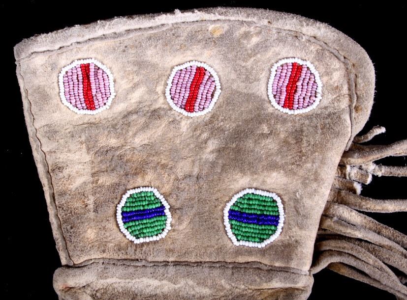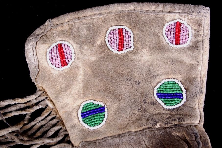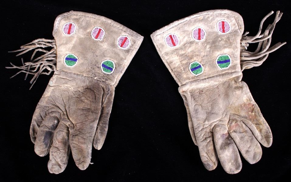 This lot features a Sioux beaded gauntlets from the early 1900's. This piece is a great example of Native American craftsmanship, the bead work is beautiful and colorful. The beads are of red, pink, white, green, and blue beads. The gauntlets have a nice fringe and show good condition for their age, showing wear appropriate for their age. They measure 10 1/4" L x 6 1/2" W