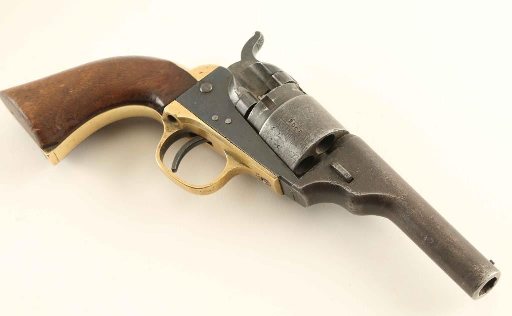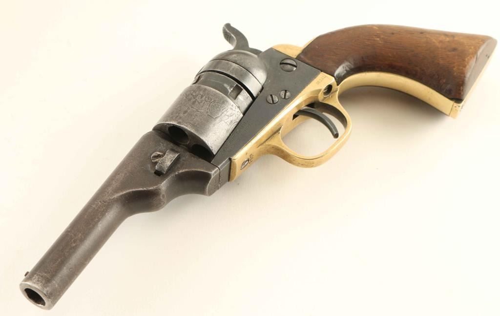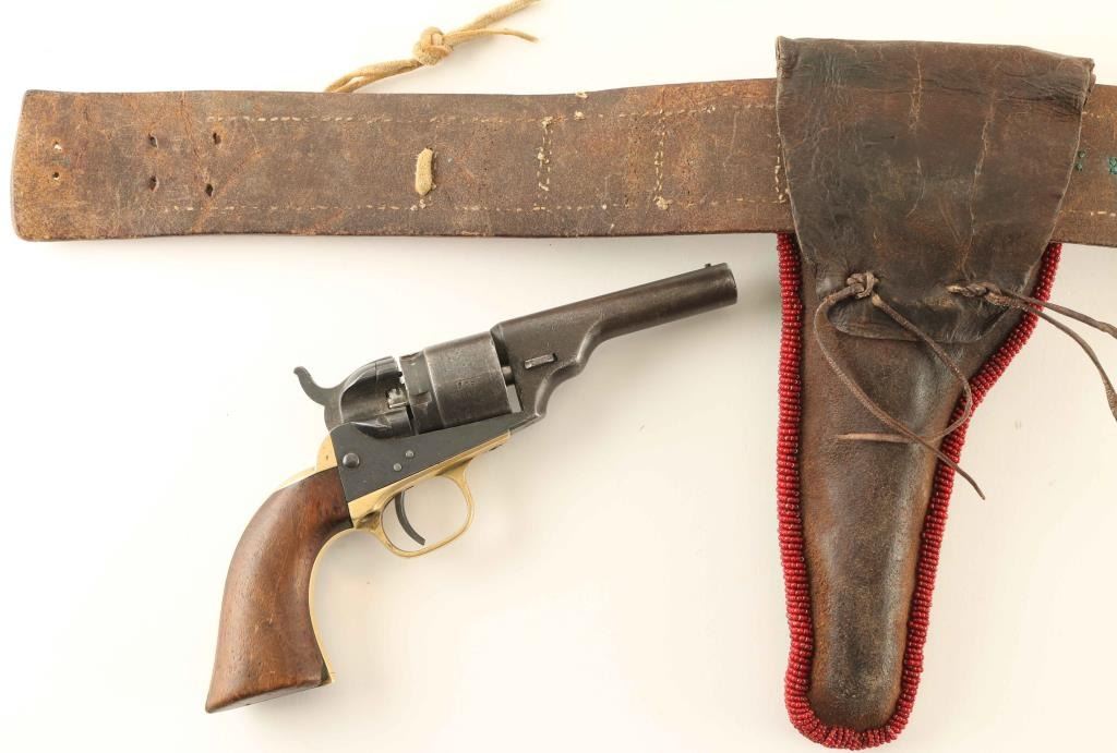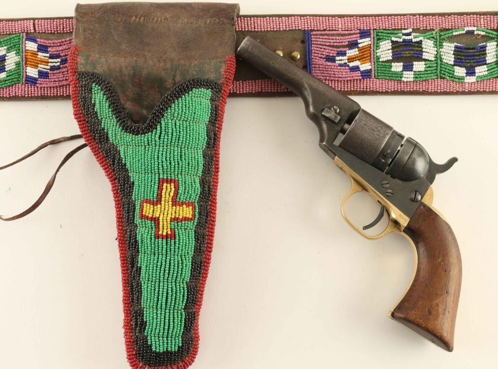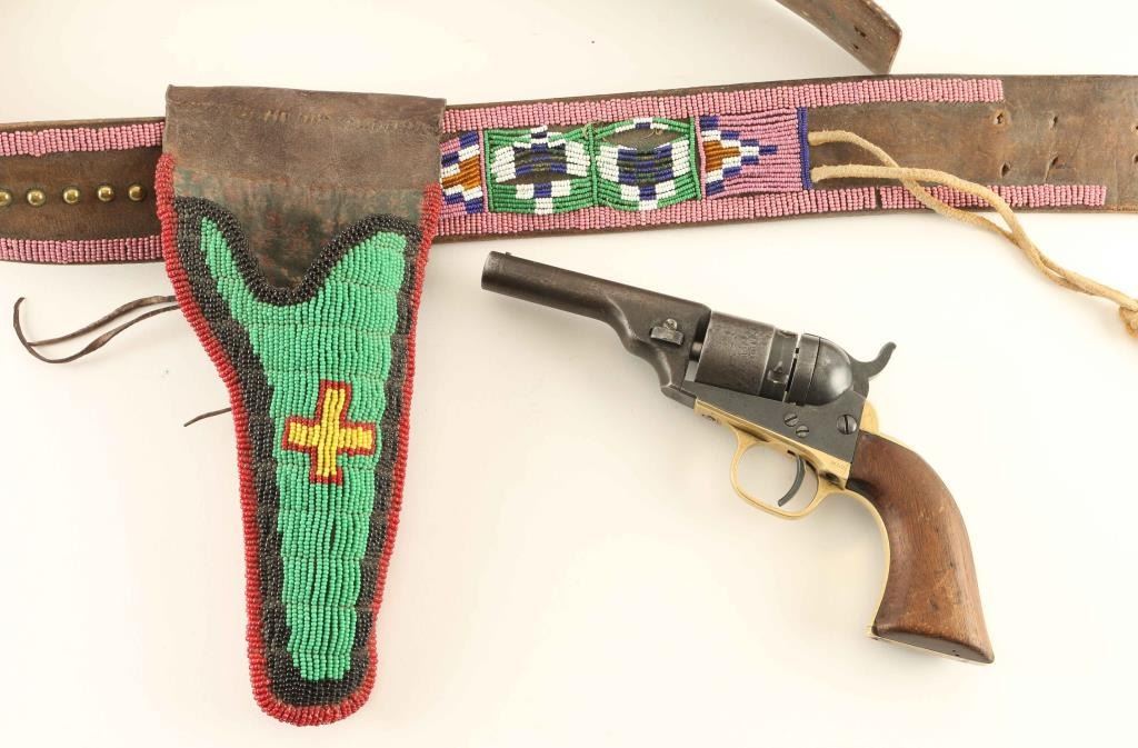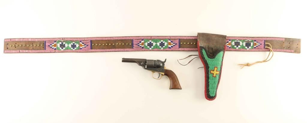 Leather multicolored beaded gun rig and holster which holds a Colt Pocket Conversion .38 centerfire caliber revolver #2308 with 3 1/2" round barrel without ejector, five-shot cylinder with stage coach hold-up scene, brass grip frame & one-piece walnut grip. Matching numbers on the barrel, frame, triggerguard, backstrap & cylinder. "PAT. JULY. 25, 1871/PAT. JULY. 2, 1872" patent dates on the frame. Approx. 60% cylinder scene intact. Shows a nicely aged patina with minor pin prick pitting in areas. Working the hammer does not rotate the hammer and in most cases the hammer will not lock into the cocked position. Condition is good as antique.