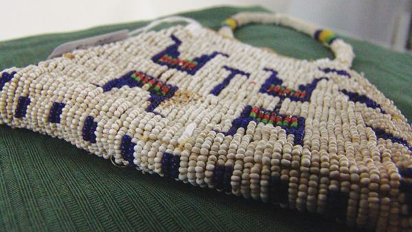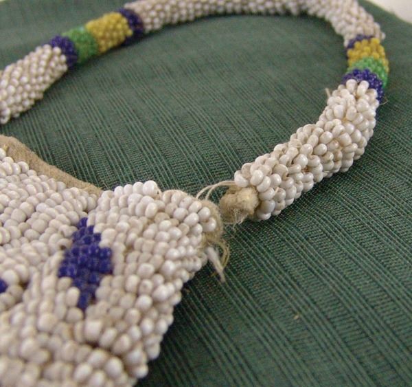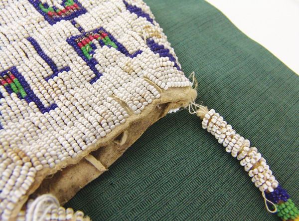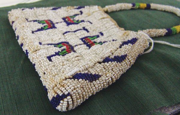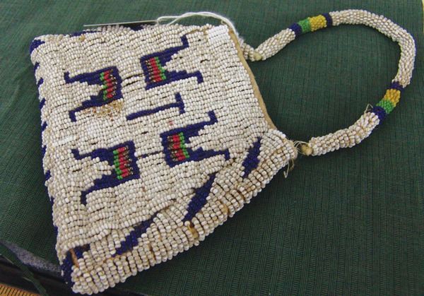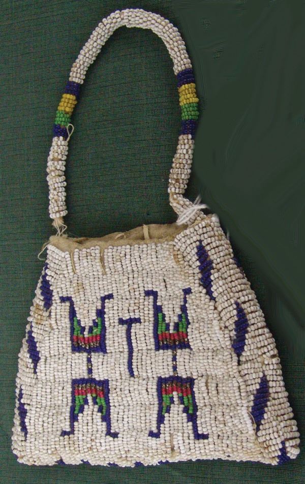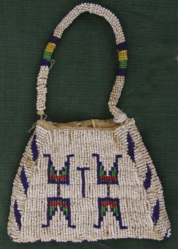 Unique, sinew sewn and lazy stitch beaded small sized bag/purse with geometric forms done on a white field, and with round beaded strap. Good condition, some loose/missing beads, and fragile handle.Early 1900s4" x 5-1/2"