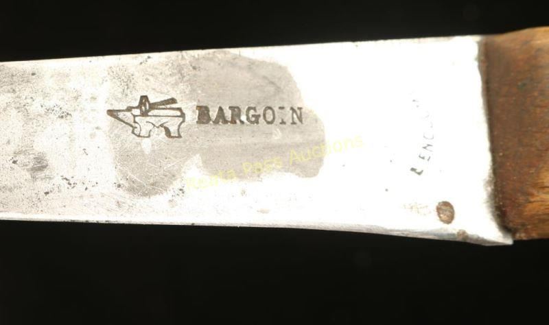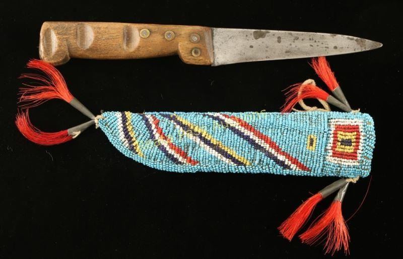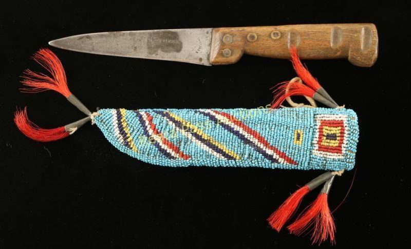 Sioux beaded scabbard with a striped beaded design in blue, red white and yellow accented with jingle bells, red dyed horse hair. Knife is Barjoin French knife with grooved wood handle measures 10" overall with a 4 1/2" blade. Shows age. Knife scabbard in excellent condition, shows age.