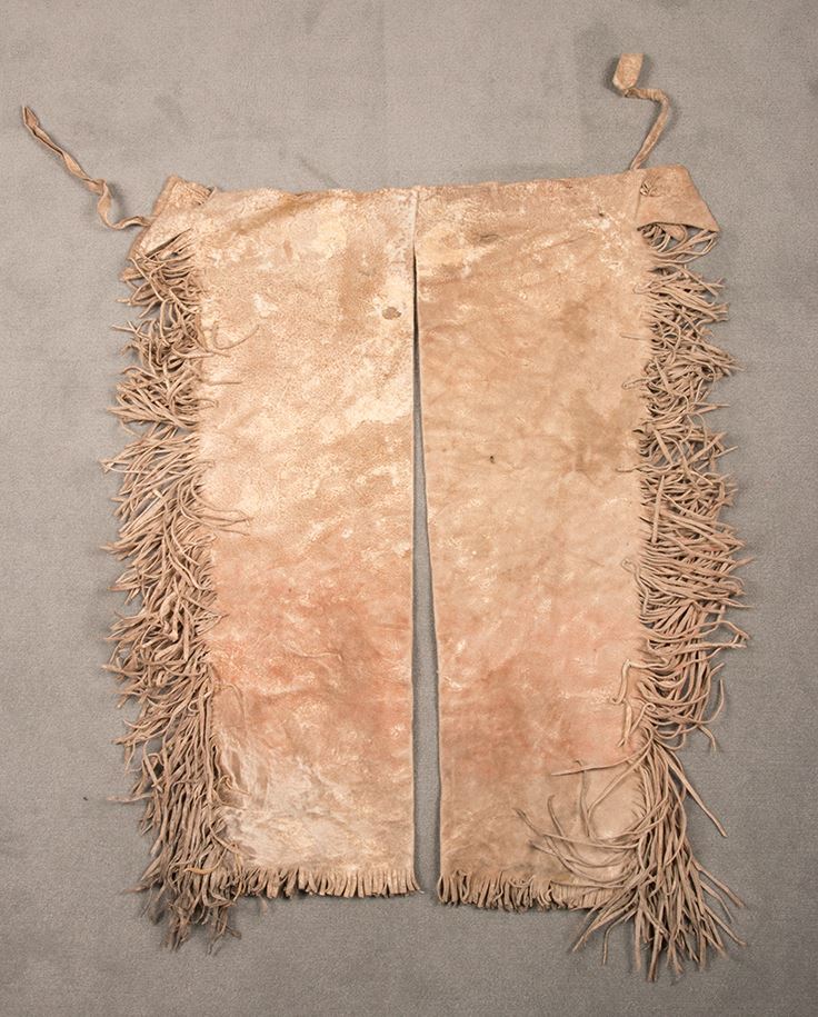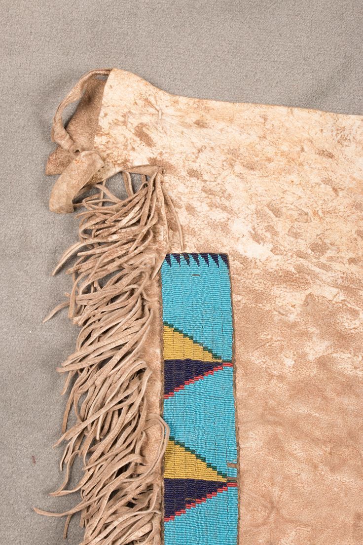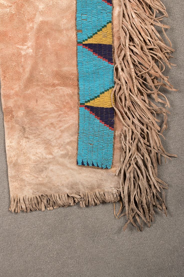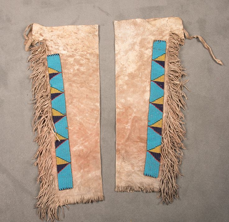 Sioux Beaded Leggings. 33" long x 14" at widest point. Graduating fringe beginning at 4" and ending with 6". Beaded strips on a blue background. Circa 1870.