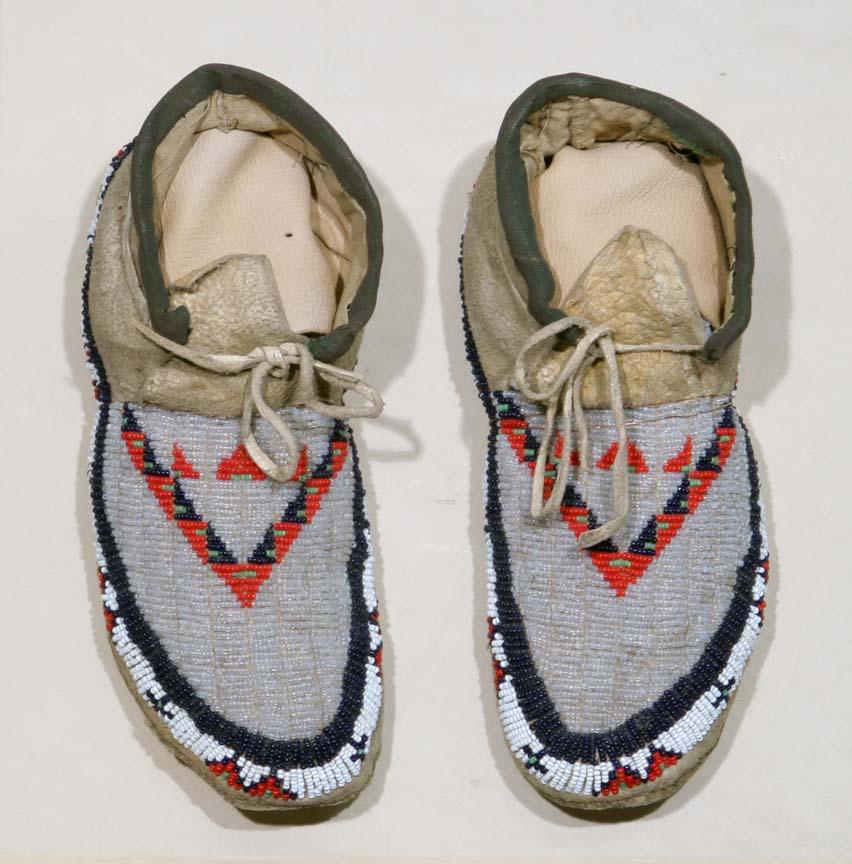Sioux Beaded Moccasins. 8 ½" long. Cased in a shadowbox frame. Circa 1920s. (est $400-600). For condition reports please visit: www.auctioninsantafe.com/cr2011.pdf