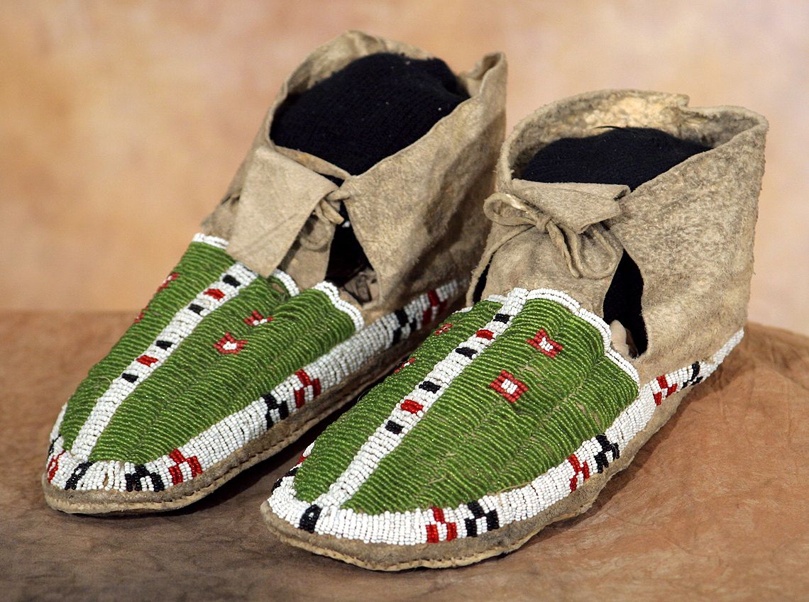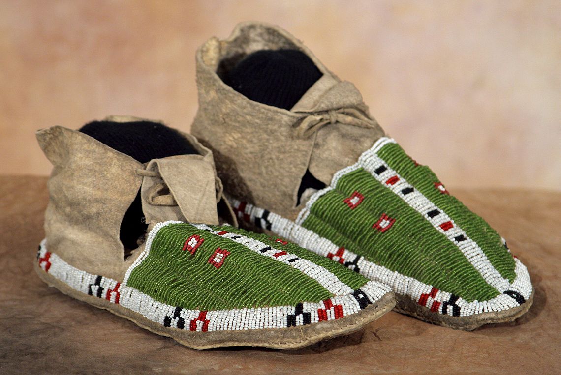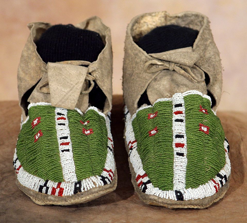 Sioux Moccasins. 10" long, fully beaded vamps in white, black, translucent red and white-heart reds on a translucent green background. A single lane of beadwork wraps around the heel. Circa 1890. (est. $1,000-1,500). CONDITION REPORTS: www.auctioninsantafe.com/docs/cr2012.pdf
