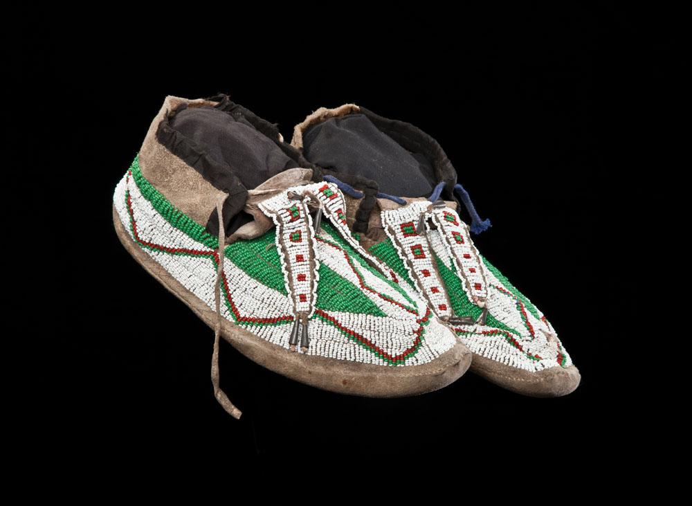 11” long, multicolored red and green zig-zag designs on native tanned hide with green buffalo tracks and bifurcated tongue with cones. Fine condition with very slight bead loss, c. 1900.