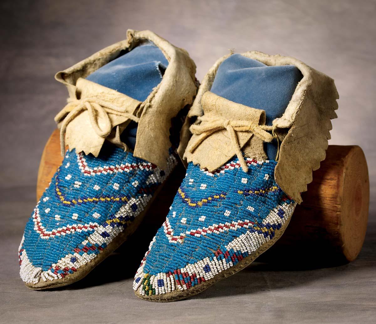10" x 3 1/2" Geometric designs in white, red, dark blue, green and yellow on trader blue field. Native tanned hide with hard soles. Fine condition, c 1890