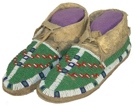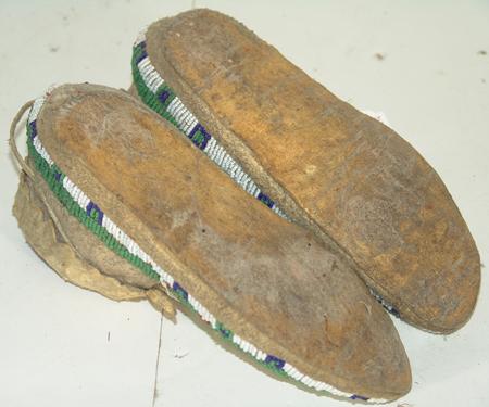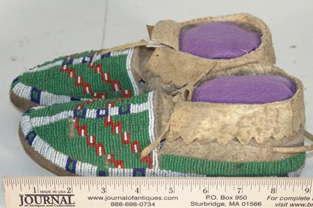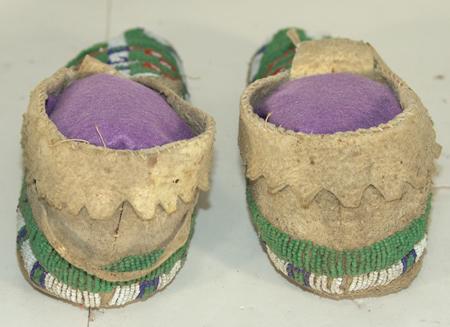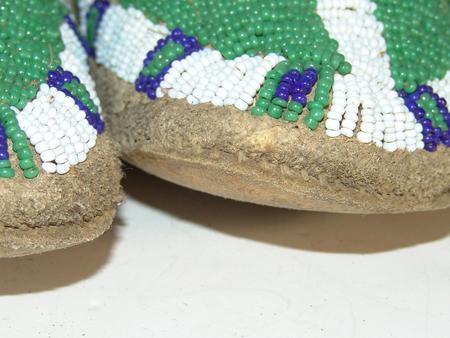 Beautiful pair of sinew sewn and lazy stitch beaded buckskin moccasins with buffalo soles and beautiful green designs. Condition: very good. 9"