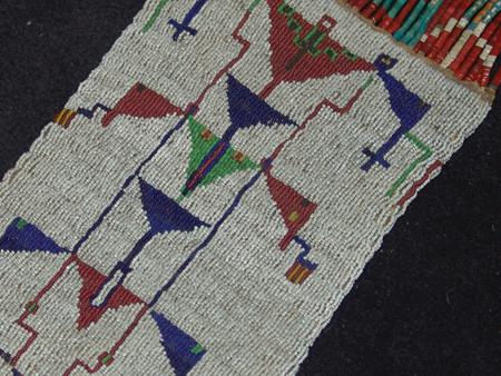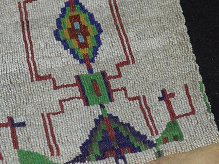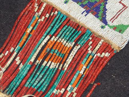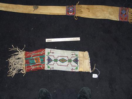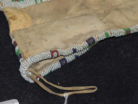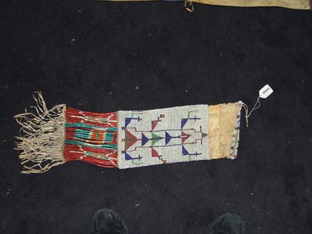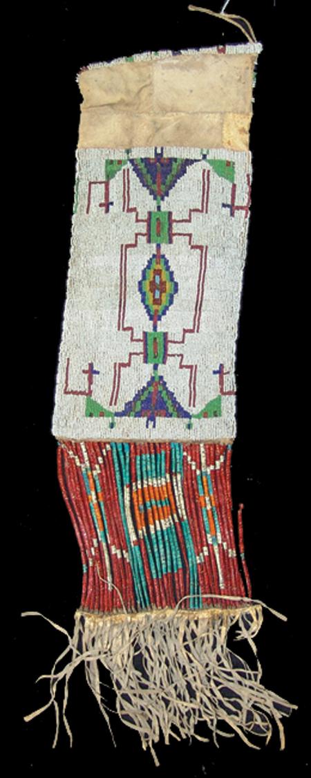 Outstanding sinew sewn and lazy stitch beaded pipe/tobacco bag with traditional Sioux symbols both sides, colorful quilled slat suspensions and fringed bottom. Very good condition.