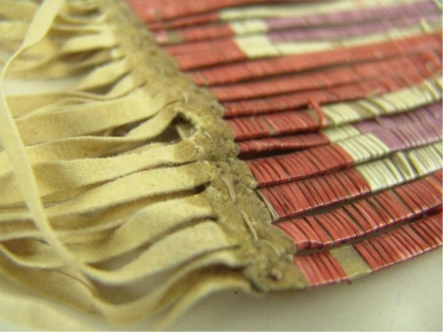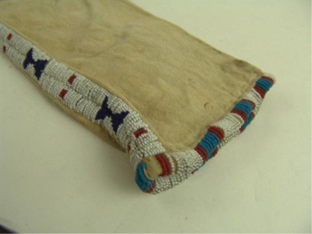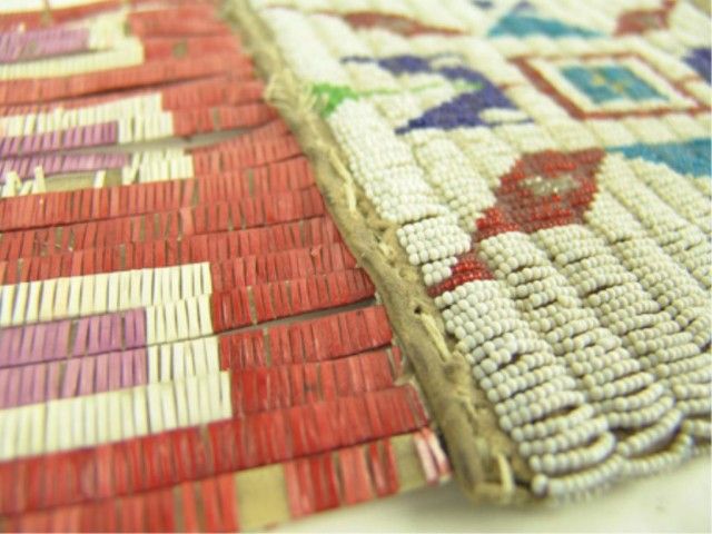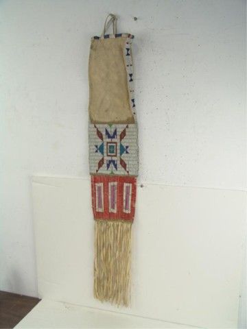 Traditional 2-sided sinew sewn and lazy stitch beaded pipe/tobacco bag with different geometric designs on both sides, 3-color quilled slat suspensions, and long fringe. Very good condition, some restoration, few missing quills.