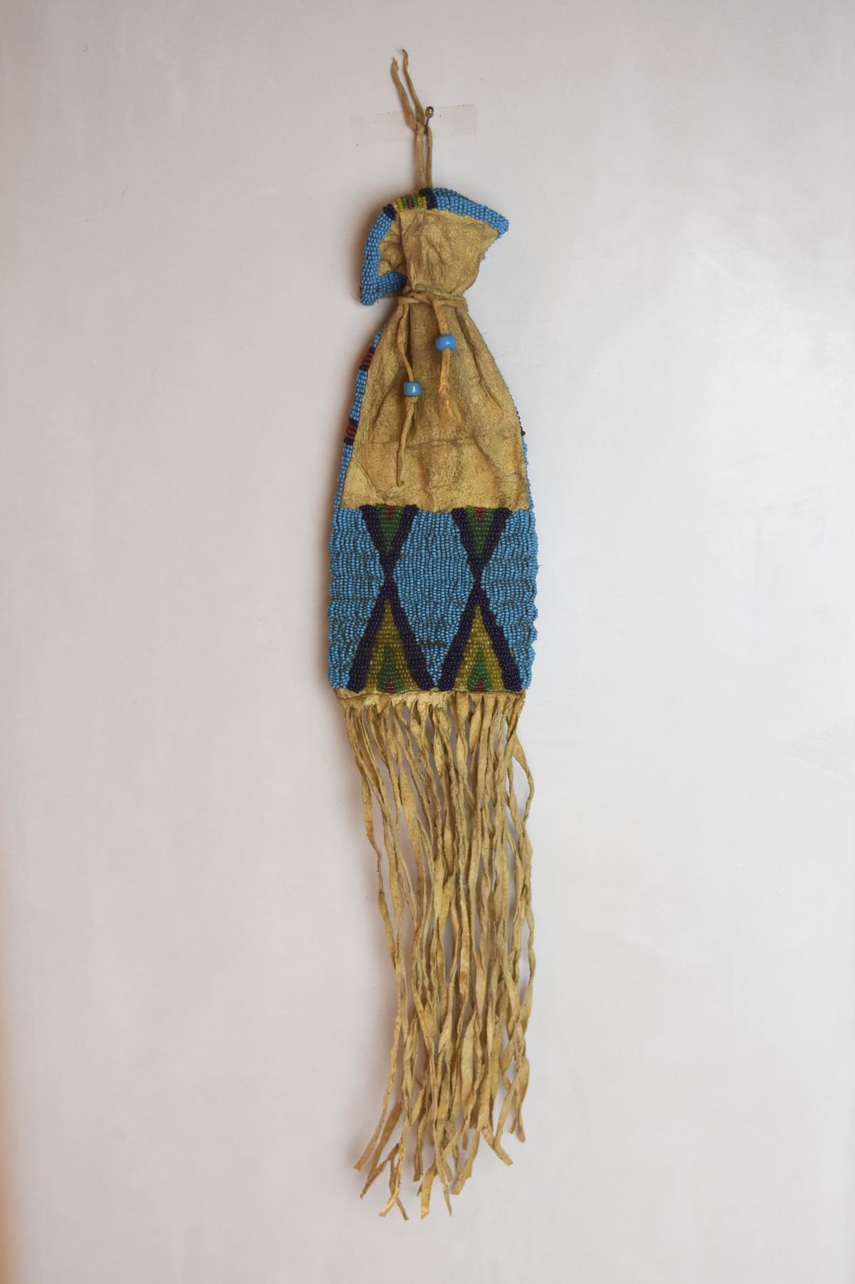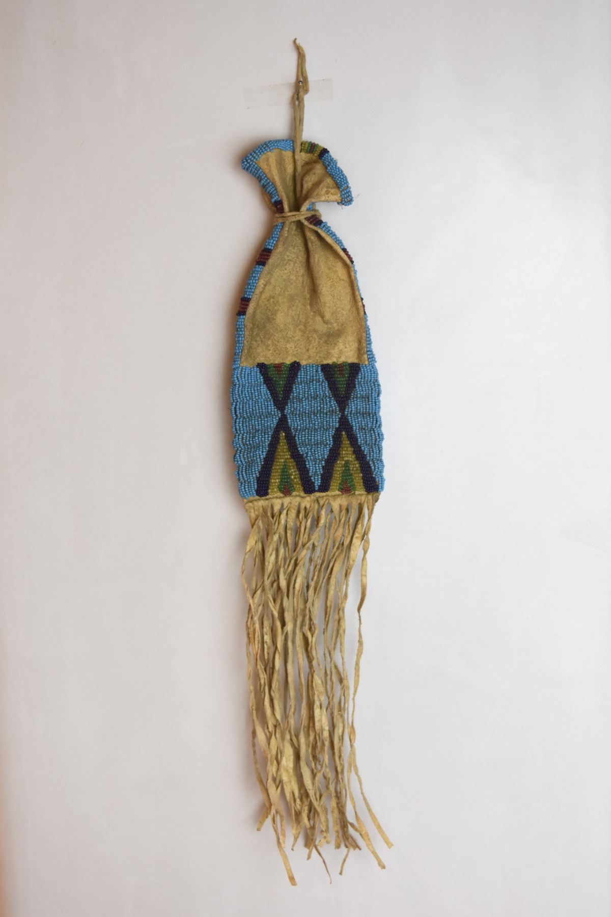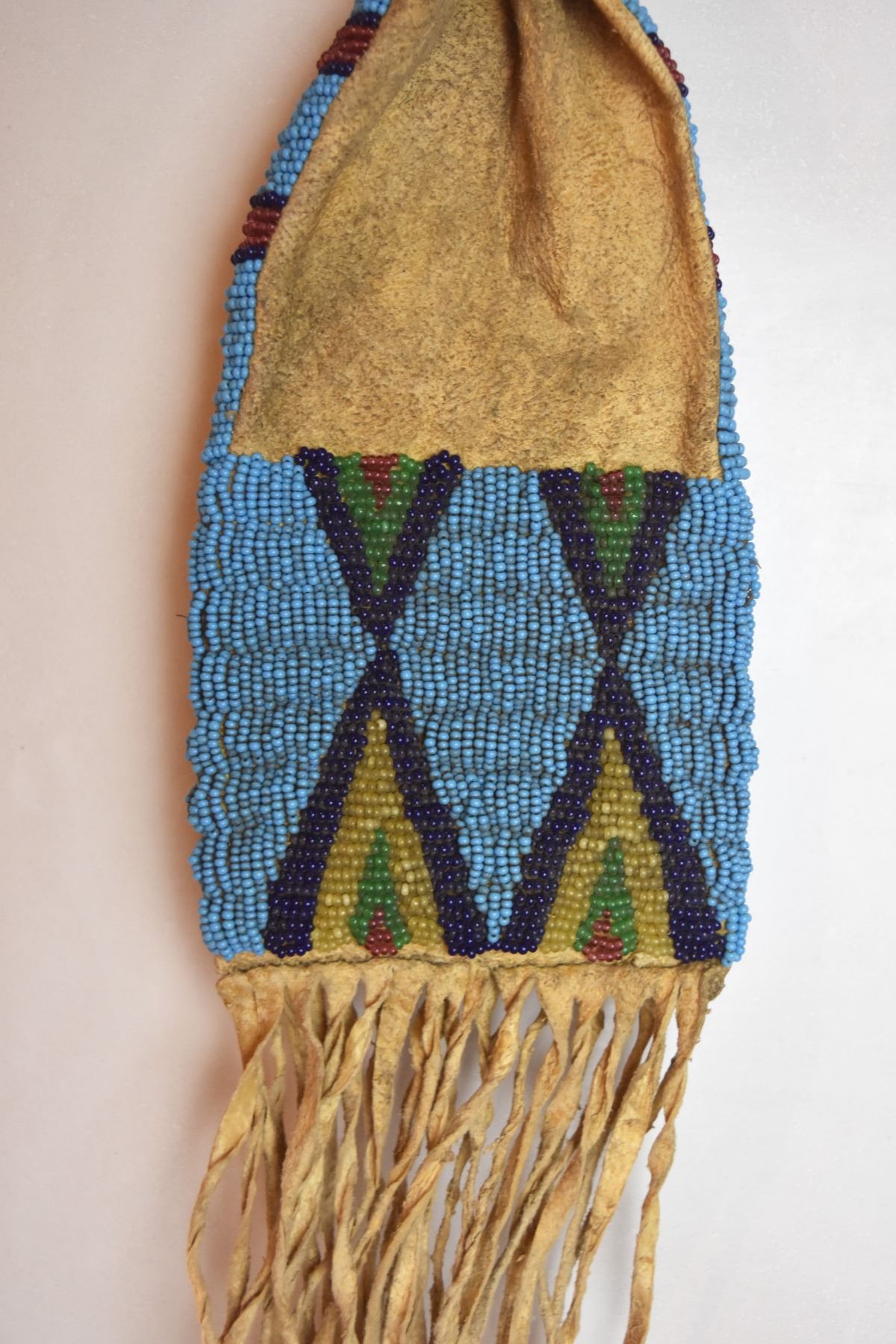 Brain tan hide, Beaded on a light blue background with inverted triangle (stars/sun) in red, green and purple, bottom triangle (earth) in red, green, brown and purple. Measures 17”L x 3 ½”w, Fringe 9”