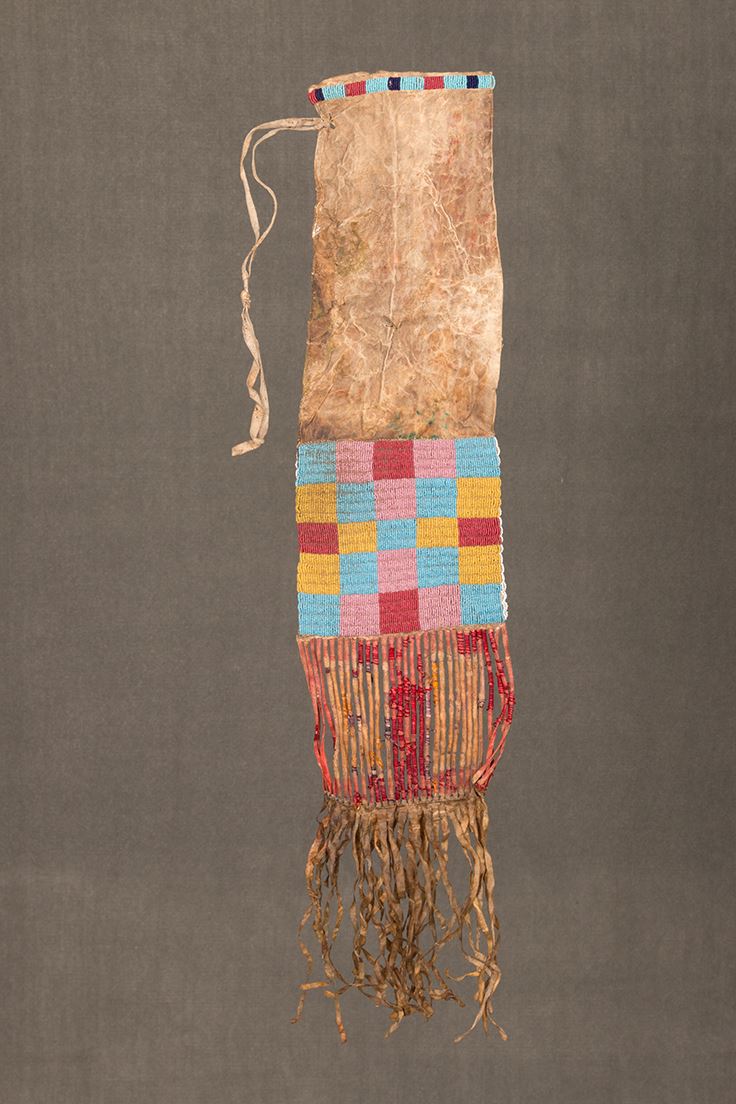 Sioux Beaded Pipebag. 34" long including 6" of quillwork and 8" of fringe. 7" at widest point. Beaded designs differ from front to back; checkerboard on one side and bi-color chevron design on opposite side. Highly unusual. Circa 1890.