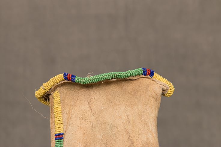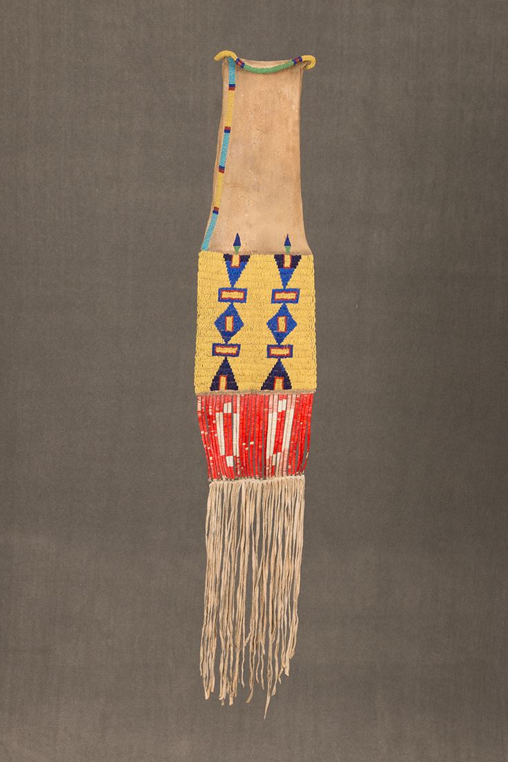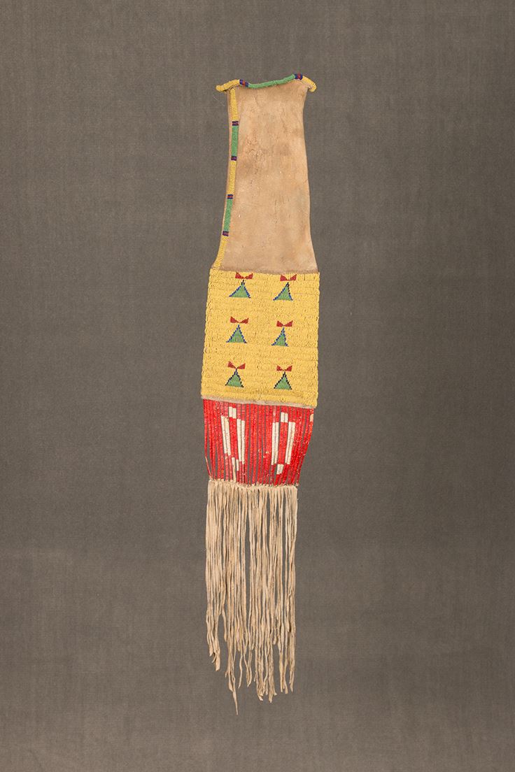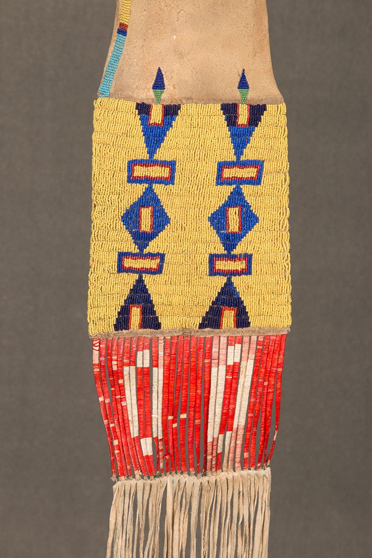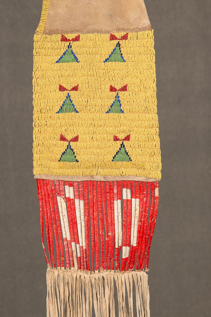 Sioux Beaded Pipebag. 41" long including 5" of quillwork and 13" of fringe. 7 ½" at widest point. Greasy yellow background with tasteful red and green geometric design elements on one side. Blue and red designs on the opposite side. 19th century.