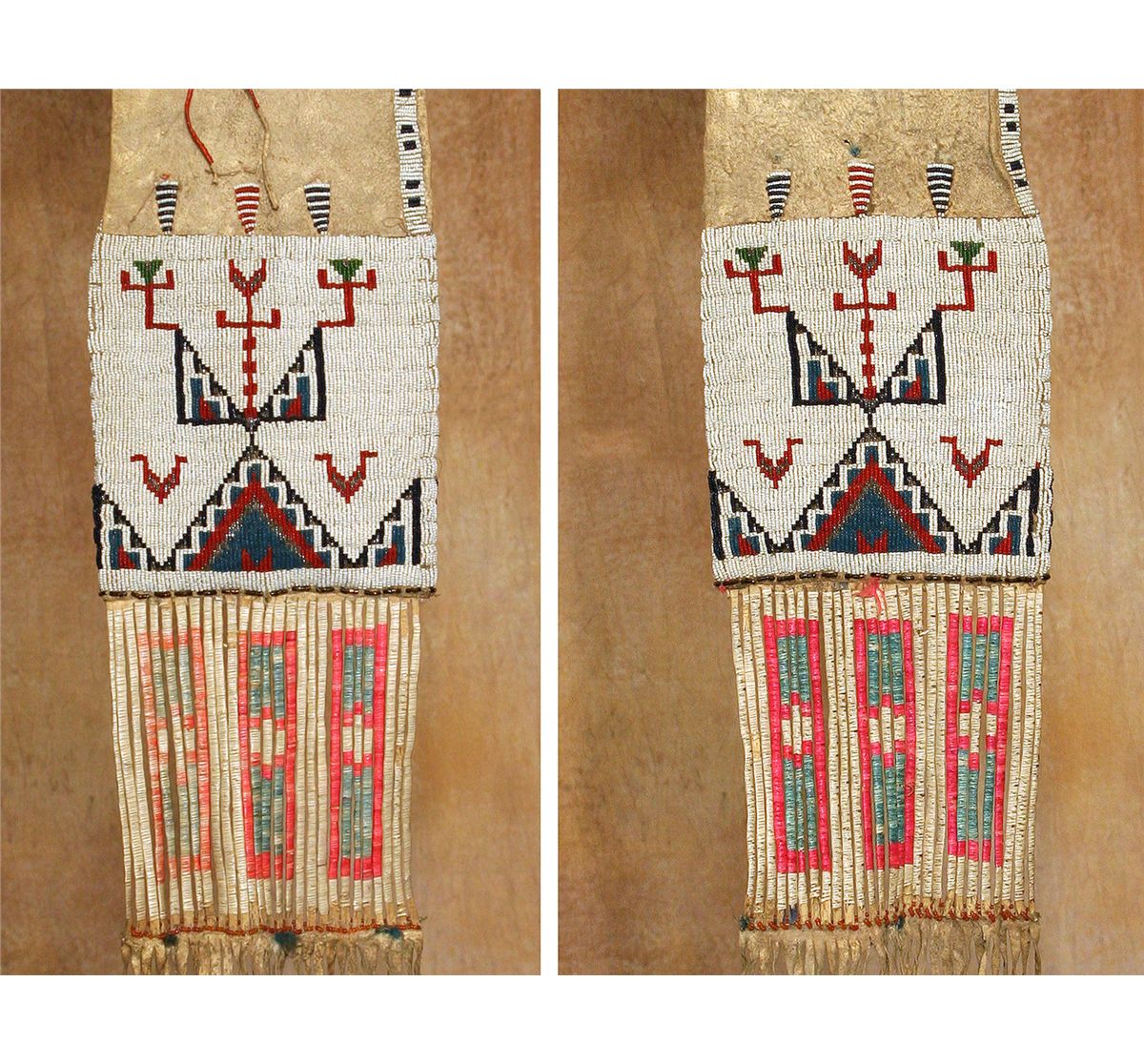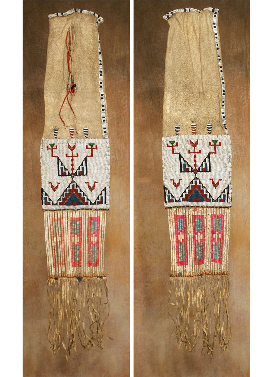 Sioux Beaded Pipebag. 28" long plus 7" of quillwork & 8" of fringe. Beautiful beadwork in traditional designs with a lane of blue & white beadwork up each side. Four drops, two with trade beads & two are quilled. 19th century.