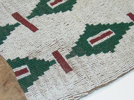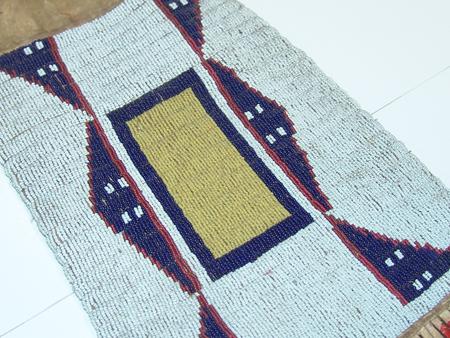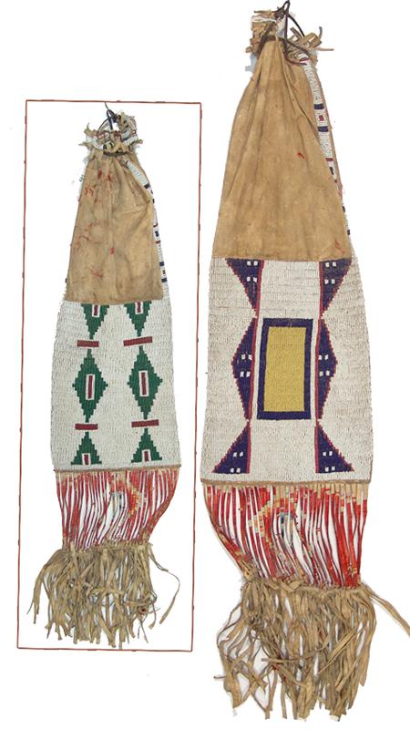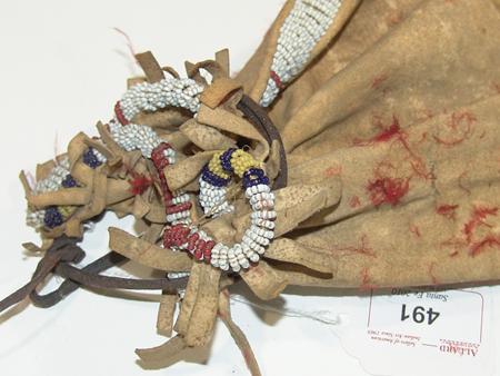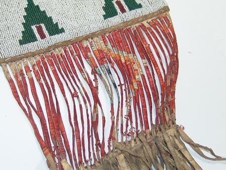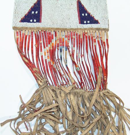 Unusually large sinew sewn and lazy stitch beaded buckskin bag with finely quilled slat suspensions and fringe, beaded edging, and two-sided geometric design. Condition: very good. 34" x 8-1/2"