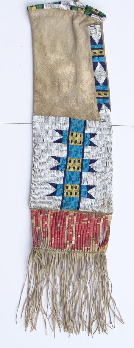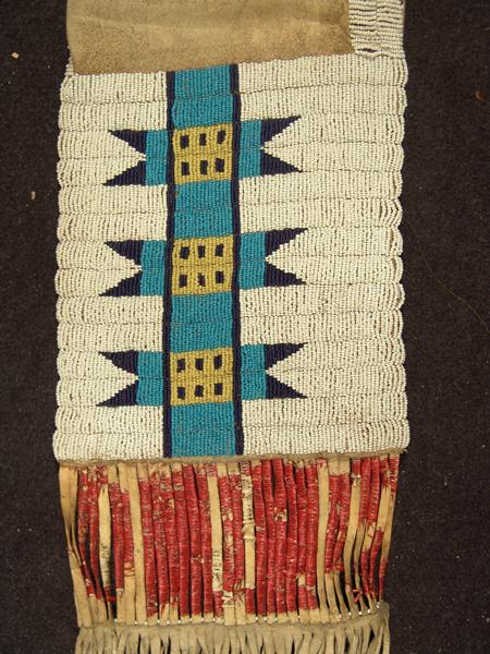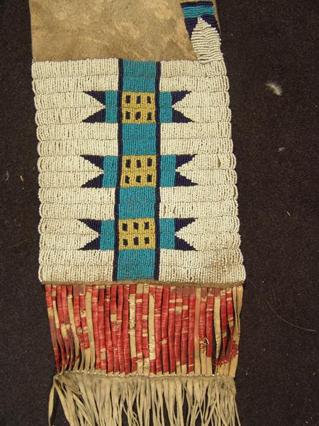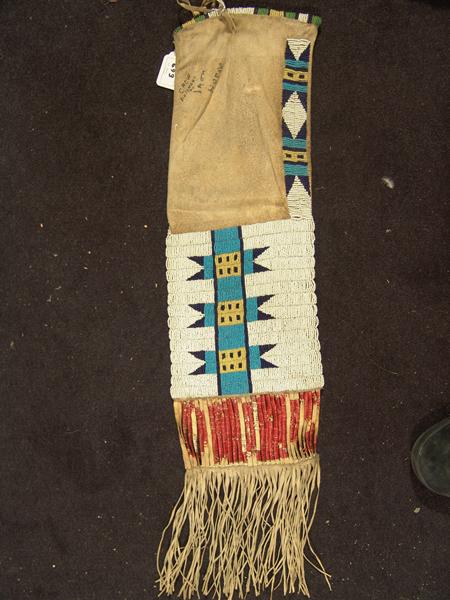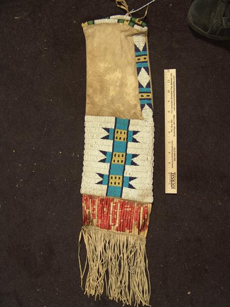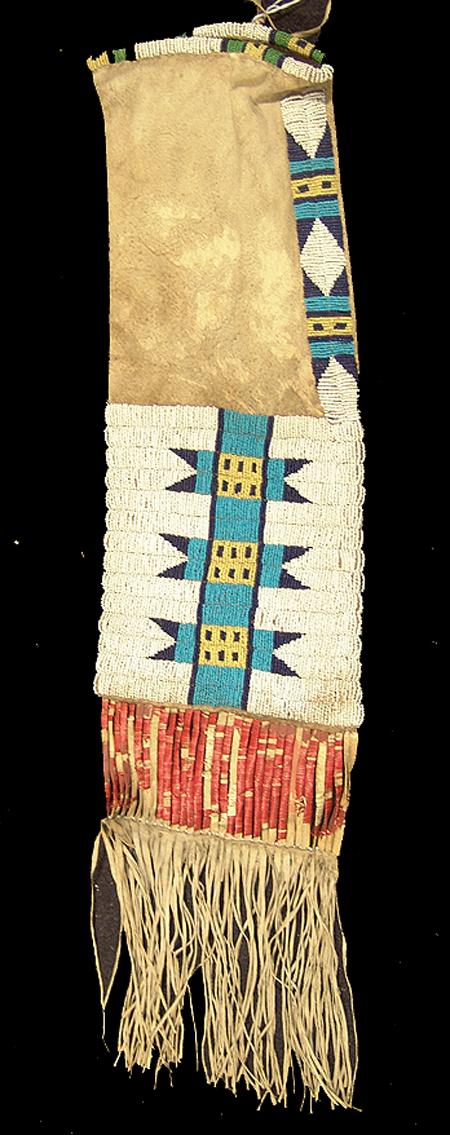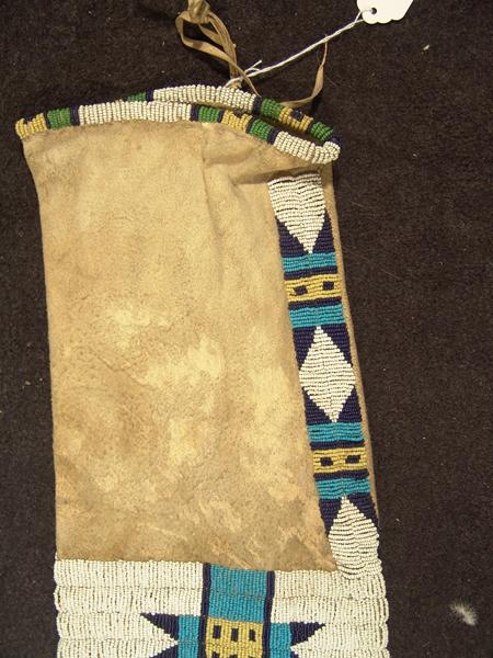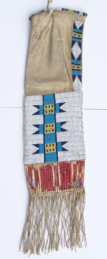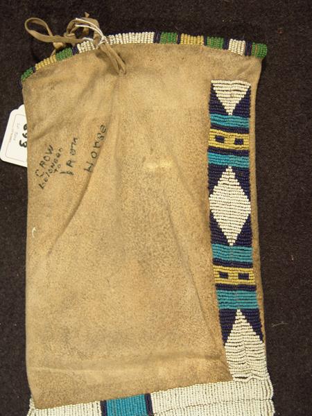 Beautiful sinew sewn and lazy stitch beaded pipe/tobacco bag with same design on both sides, quilled suspensions, and fringe. Although Sioux style, it is written in pen on back "Crow, belonged to Iron Horse". Purchased in 1975 for $300; appraisal value $