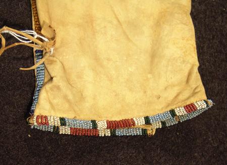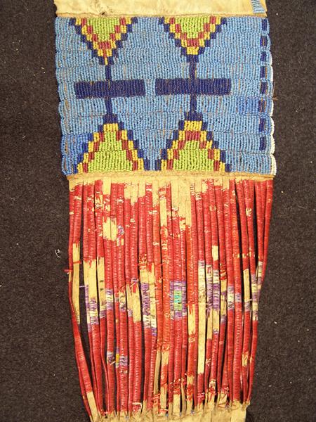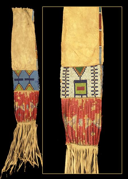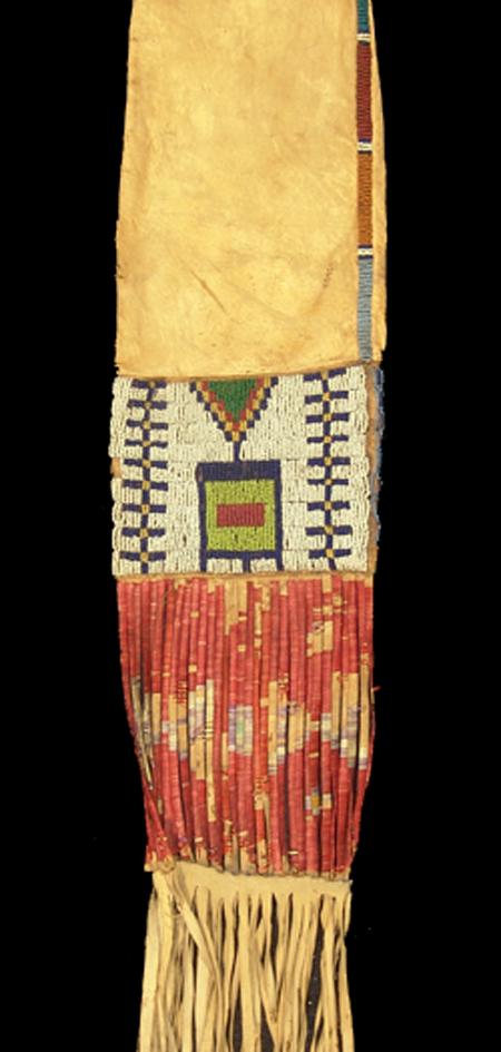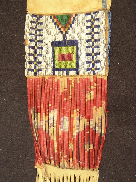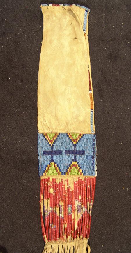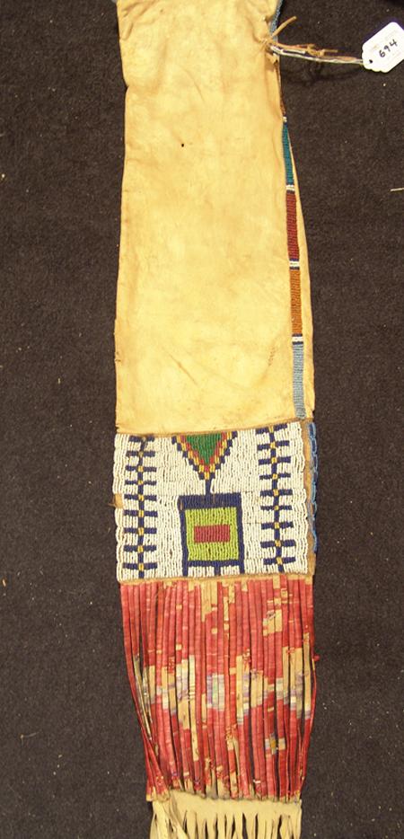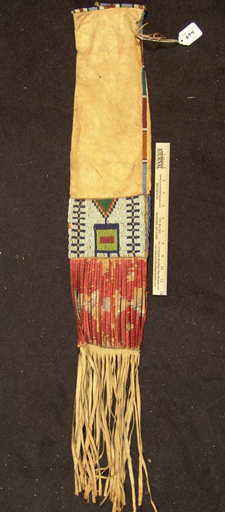 Classic, long, sinew sewn and lazy stitch beaded pipe/tobacco bag with different designs on each side, quilled red slats, and long fringe. Purchased in 1975 for $275; appraisal value $4,500. Condition: good, minor bead loss and wear. 38" long (includes fr