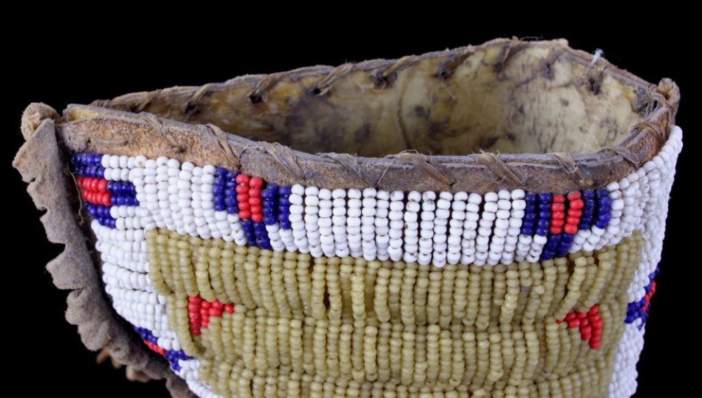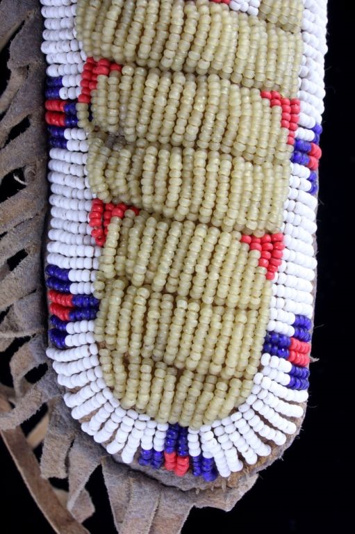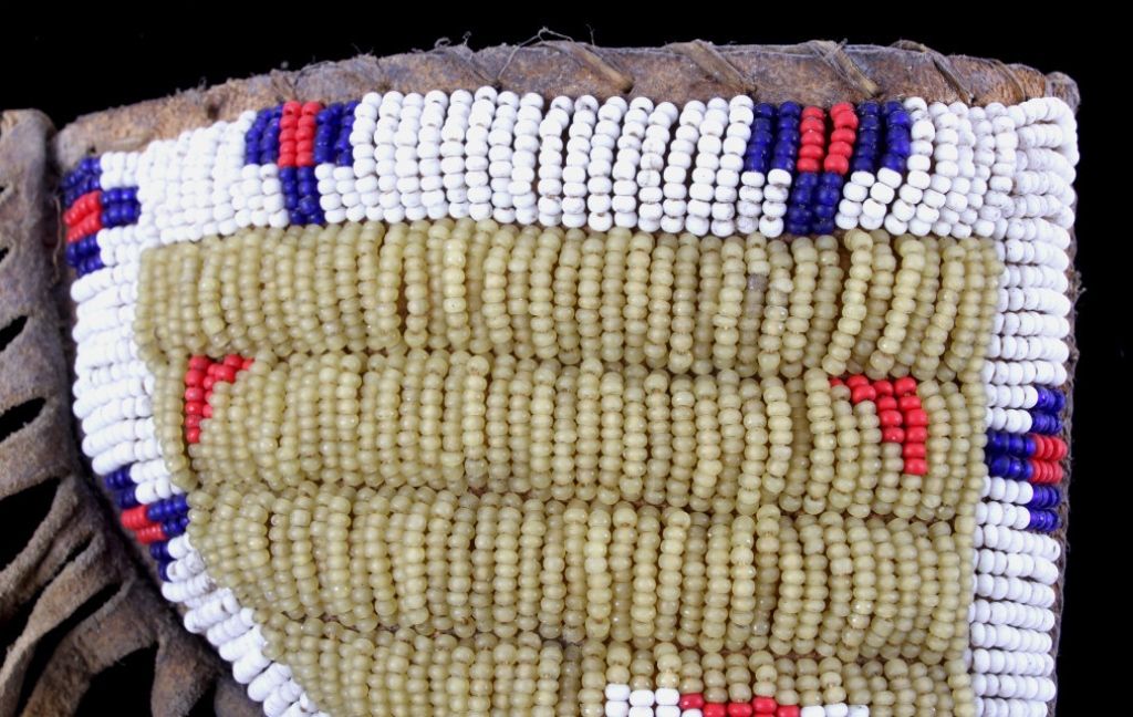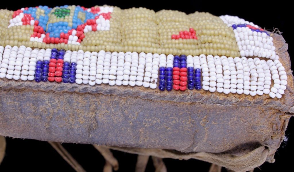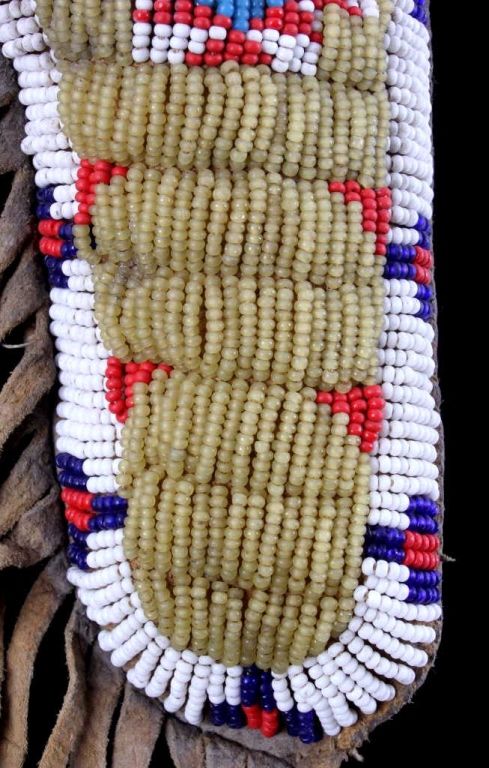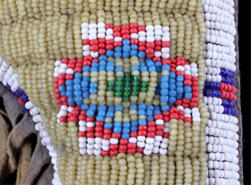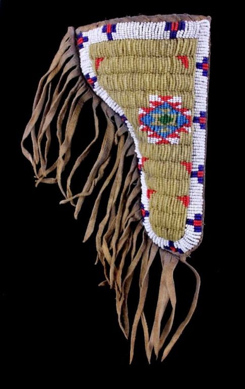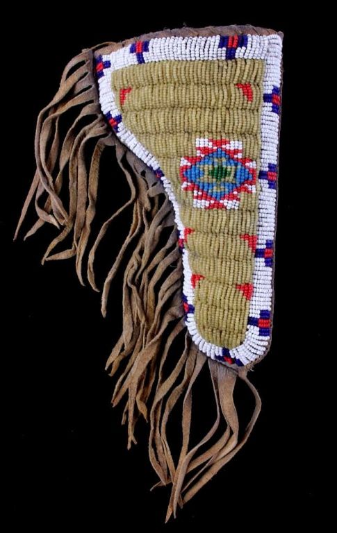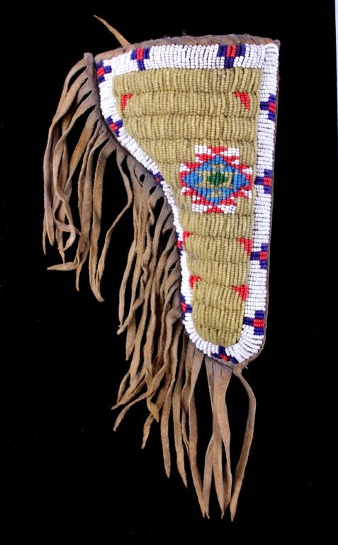 The piece is from the Sioux Native American Indian people and shows a tightly beaded pistol holster. The holster is constructed of Indian brain tanned hide and has a rare parfleche lining with all sinew sewn. Theholster shows impressive 1800's glass trade seed bead work with a wonderful greasy yellow base. This rare piece is from circa 1890-1900 and measures 4.25"x7" without fringe (total with fringe 15" long.