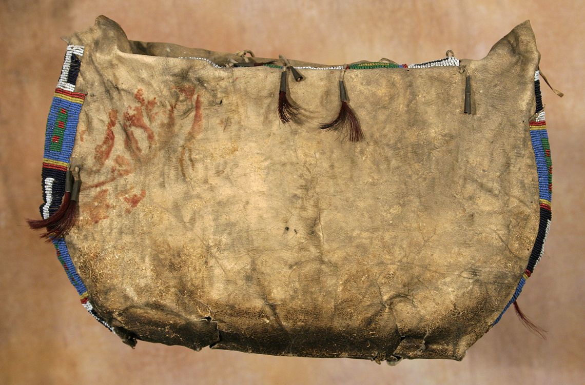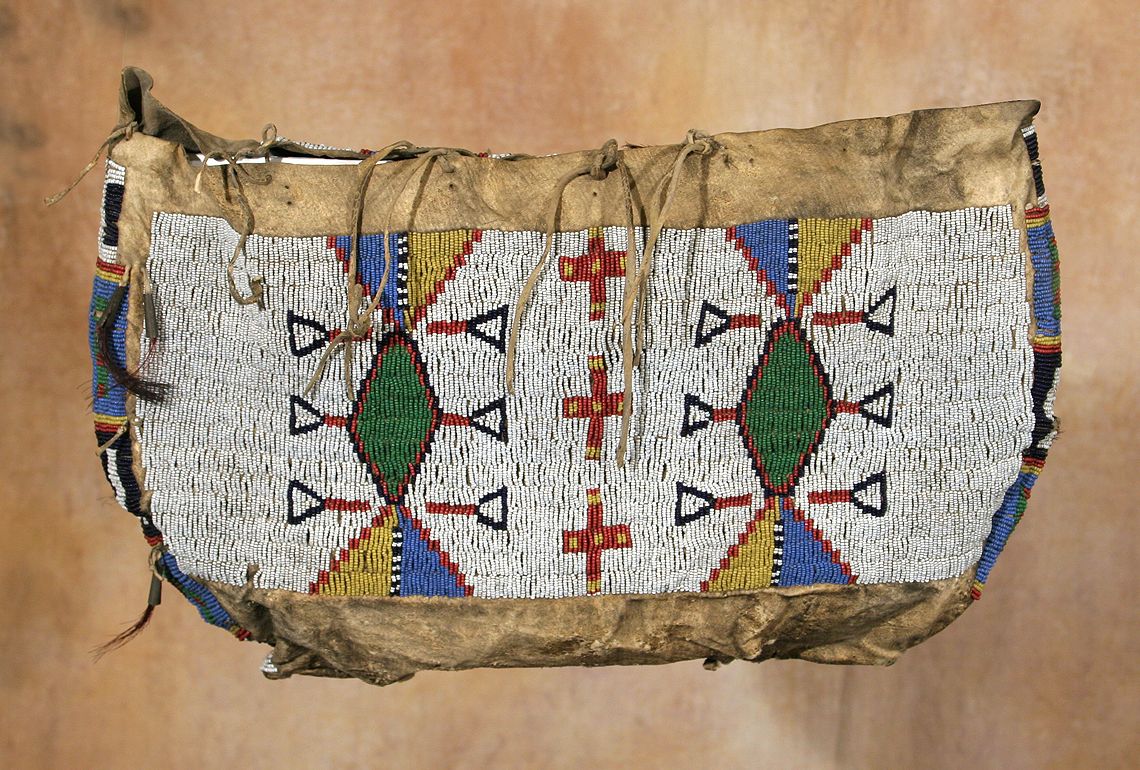 Sioux Beaded Possible Bag. 18" x 11" with fully beaded panels on front, sides & top. Tin cone accents with remnants of dyed horsehair tassels adorn sides. 19th century. (est. $1,500-2,500). CONDITION REPORTS: www.auctioninsantafe.com/docs/cr2012.pdf