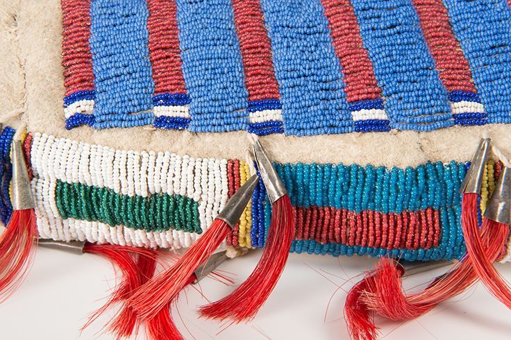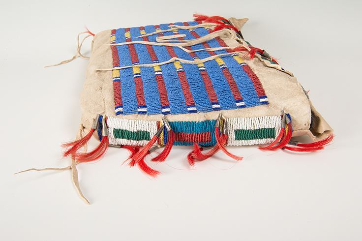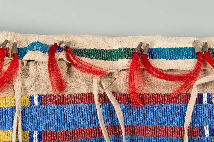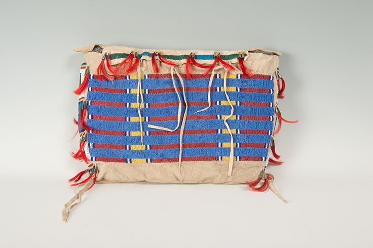 Sioux Beaded Possible Bag. Large 13" x 19 ½" bag with classic Sioux colors and designs. Accented with dyed horsehair-stuffed tin cones along the top and sides of bag. Early 19th century.