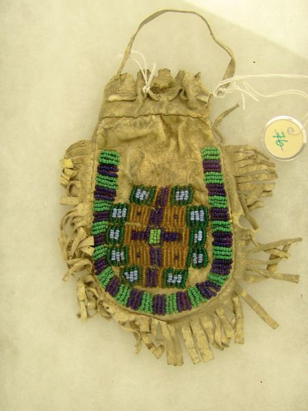 Ca. 1920s, Small sinew sewn and lazy stitch beaded buckskin bag with fringed edging and drawstring top. Very good condition. 5-1/2" x 3"