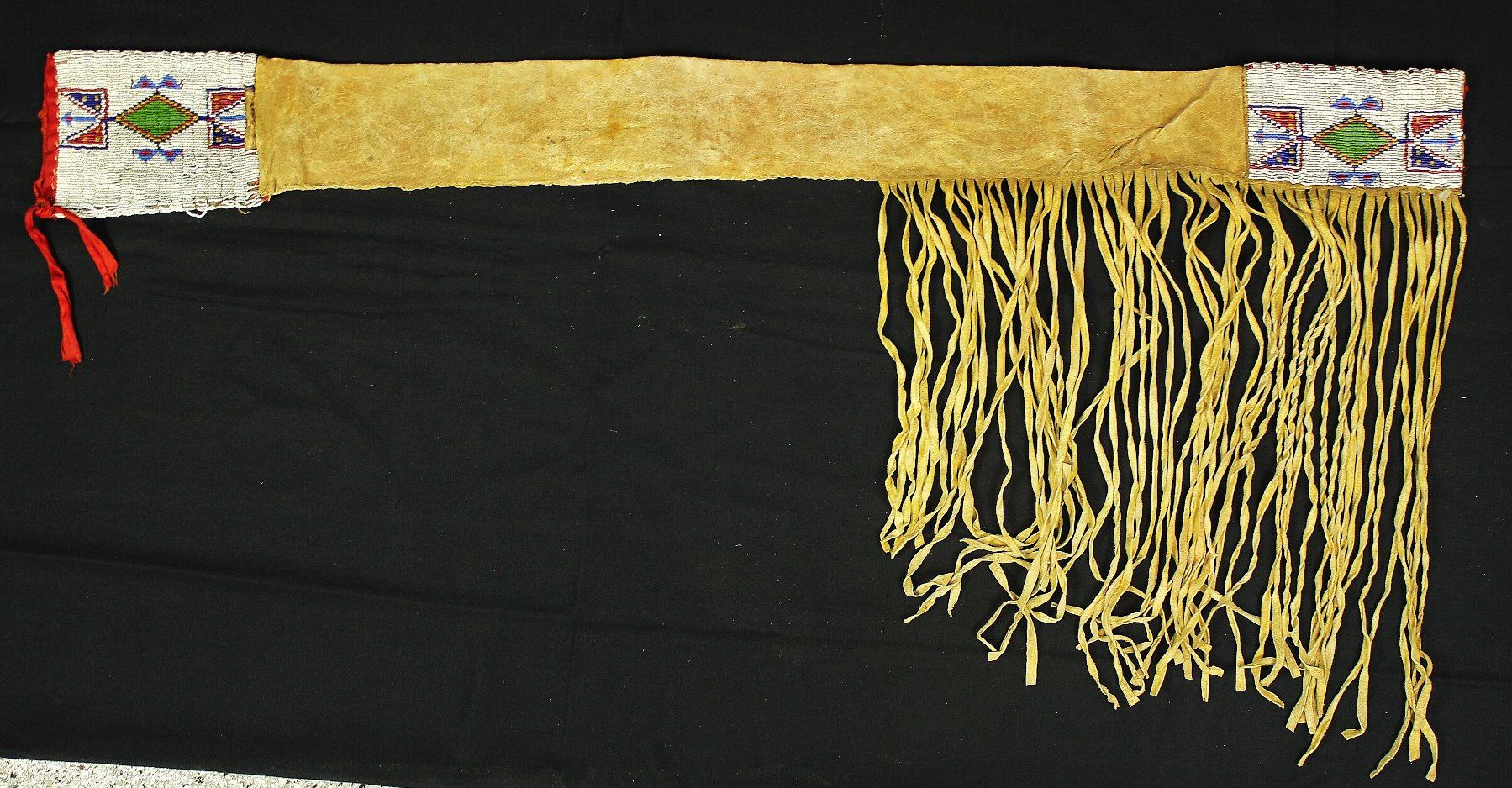 Striking pre-1900 Plains Indian brain tanned rifle scabbard with appealing beaded geometric designs that include red white hearts, cobalt blue, apple green on a white background, and with exaggerated long fringe. Showing beautiful condition and measuring 45" in length.