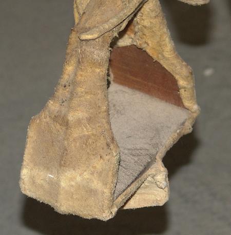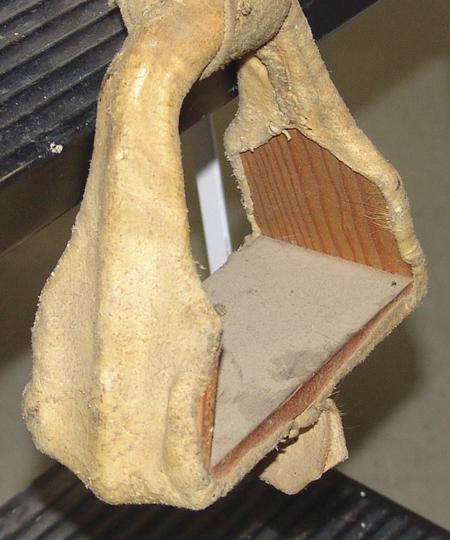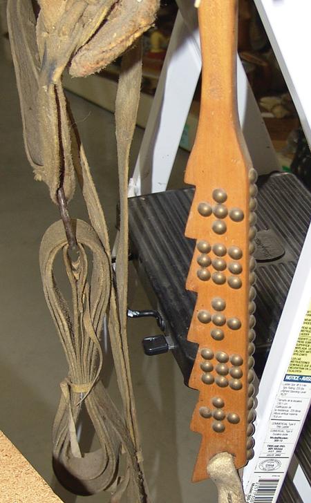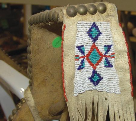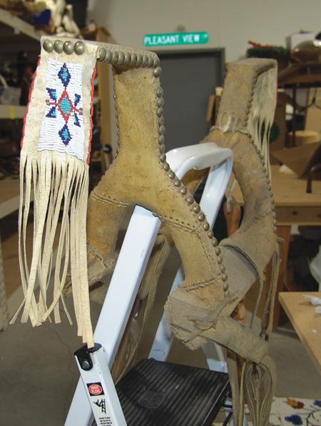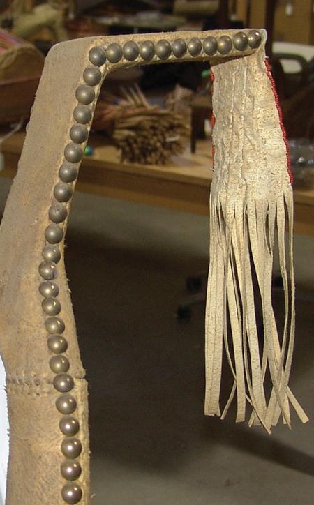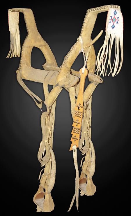 Rare, traditionally built, buffalo hide-covered tree saddle with more recent beaded tabs, brass tacks, original stirrups, and a carved wooden quirt. Condition: very good, rare. Seat 10"