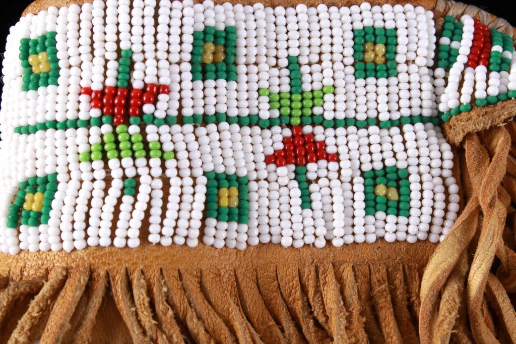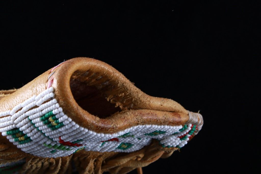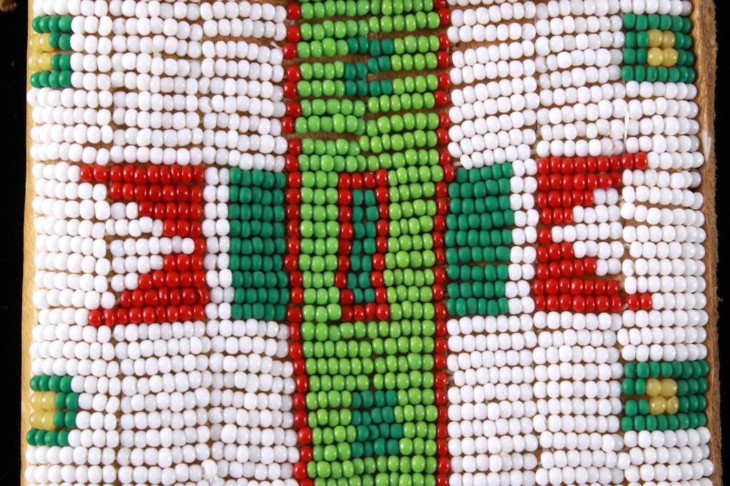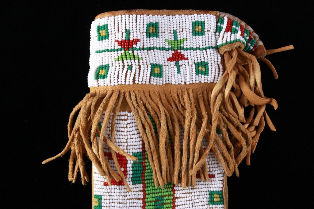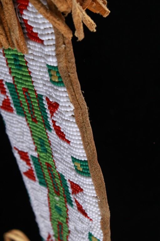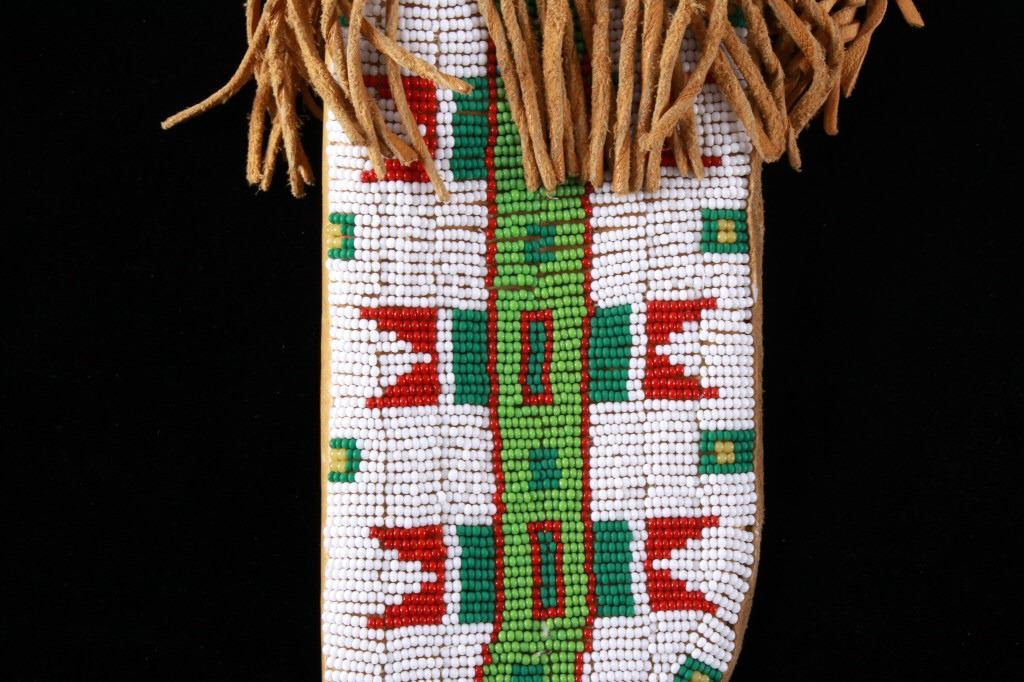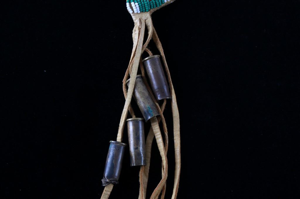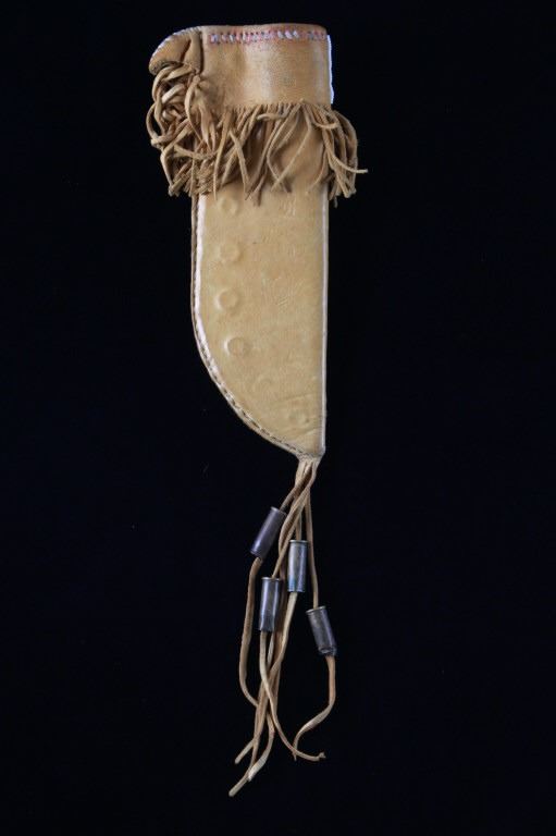 The lot features a mid-to-late 20th Century beaded sheath from the Sioux Indians paired with an old late 19th Century Indian Trade Knife. The knife features a Buffalo Skinner pattern with sharp blade having a nice dark coloring and is paired with a two piece walnut grip with copper rivets. The sheath is comprised of tanned hide leather over harness saddle leather and is covered in glass beadwork in a geometric pattern further accented by fringe along the top and bottom. The bottom fringe have four jingle cones which are comprised of brass shell casings, three W-W (Winchester Western) Winchester .38-40 cases and one W-W (Winchester Western) Super .44 Remington Magnum case. The fringes extended at the top center around to the back side. The piece was likely made for use at a ceremony, powwow or rendezvous. The sheath measures 20"L with fringes by approx. 6"W. The knife is 11 3/8"L with a 6 7/8"L blade.